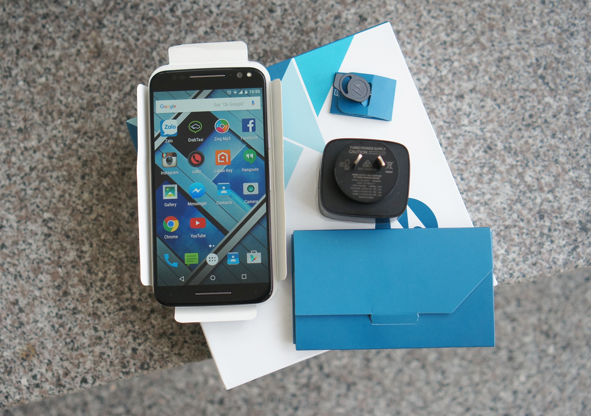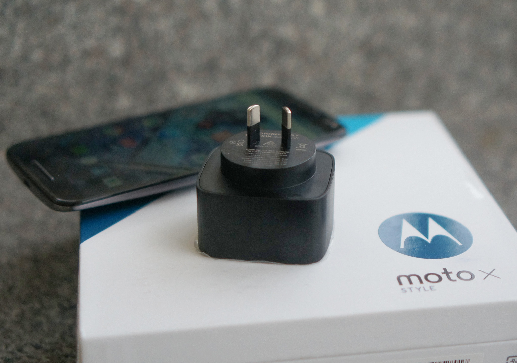 | Chiếc Moto X Style này sở hữu hộp đựng lớn bậc nhất trong số các smartphone hiện nay. Máy có đầy đủ sạc, cáp, tai nghe, que chọc SIM. Motorola còn tặng kèm một ốp viền dạng bumper bằng nhựa. Cục sạc của máy là sạc turbo, cho khả năng sạc 34% trong 15 phút. |