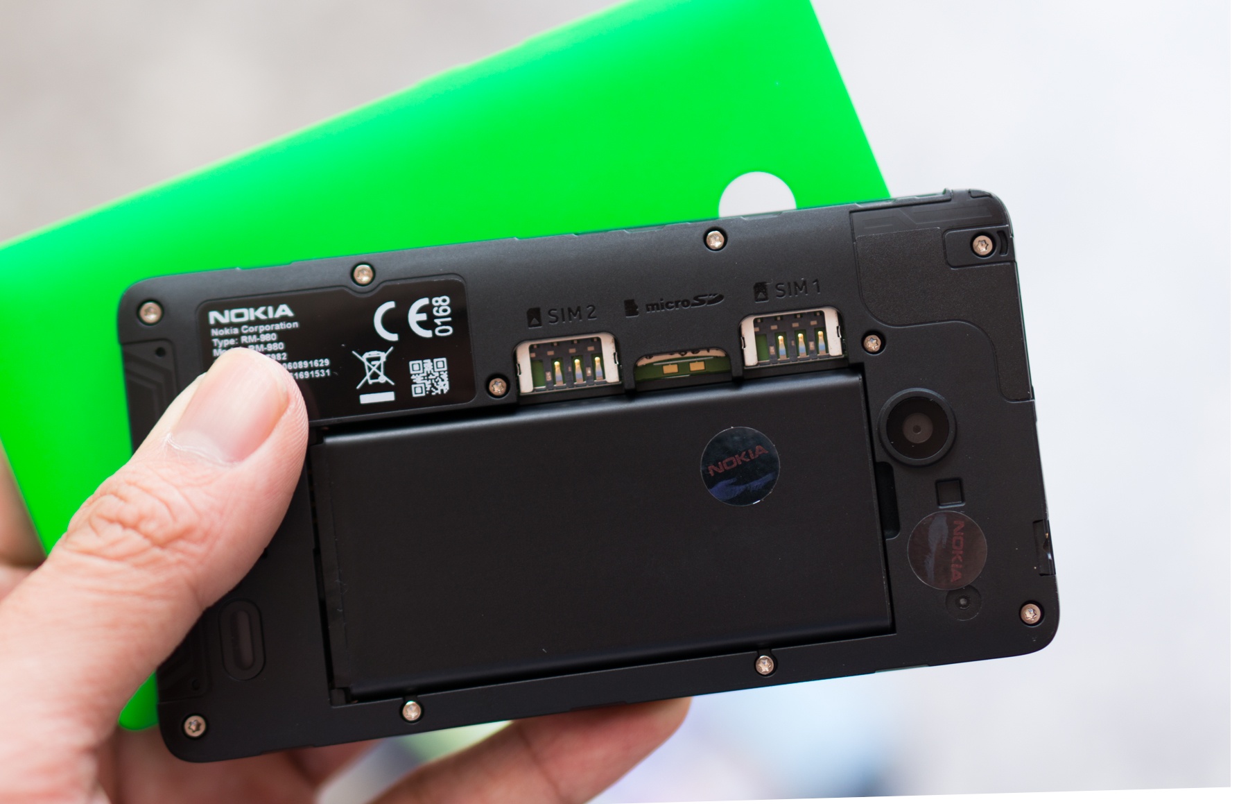 | Vì có thiết kế giả nguyên khối nên nắp lưng của Nokia X có thể mở ra để thay đổi màu vỏ và thay SIM, thẻ nhớ. |