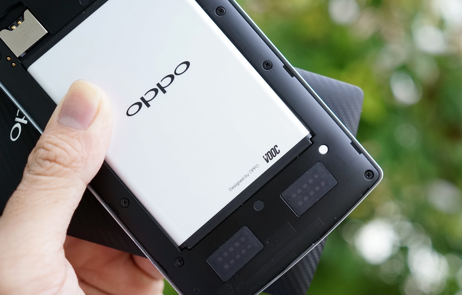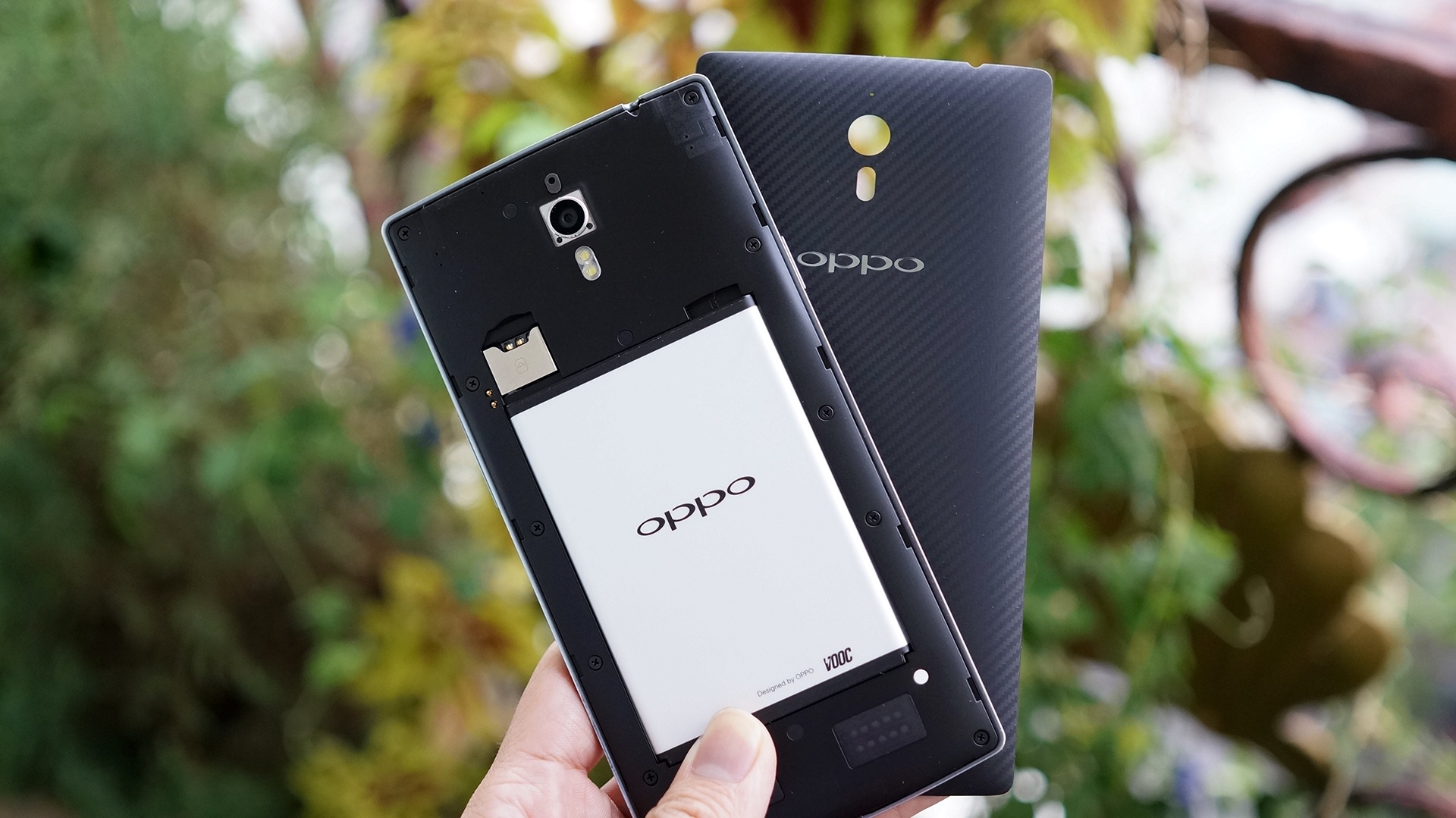 | Nắp lưng và pin của Find 7 có thể tháo rời để lắp SIM và thẻ nhớ. |