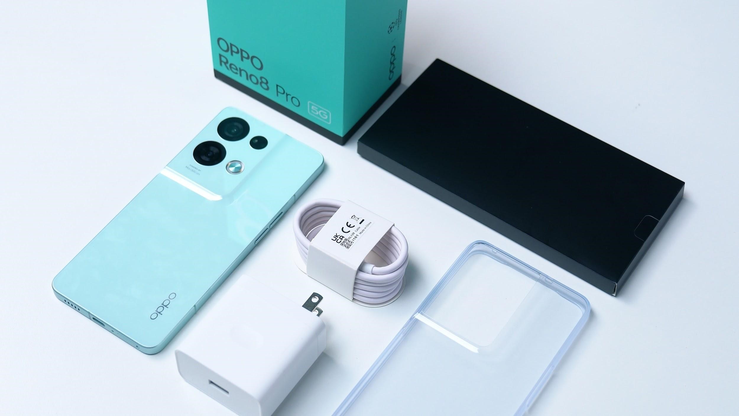 Thuộc Reno8 series, Oppo Reno8 Pro 5G sở hữu thiết kế vỏ hộp bên ngoài không có nhiều thay đổi, ngoại trừ chữ “Pro” được in thêm. Trong hộp vẫn được trang bị đầy đủ các phụ kiện: Củ sạc nhanh, cáp sạc, que chọc sim, ốp lưng. Tại thị trường Việt Nam, người dùng có 2 lựa chọn màu sắc: Xanh lục bảo và đen thạch anh khi muốn sở hữu thiết bị cận cao cấp này.