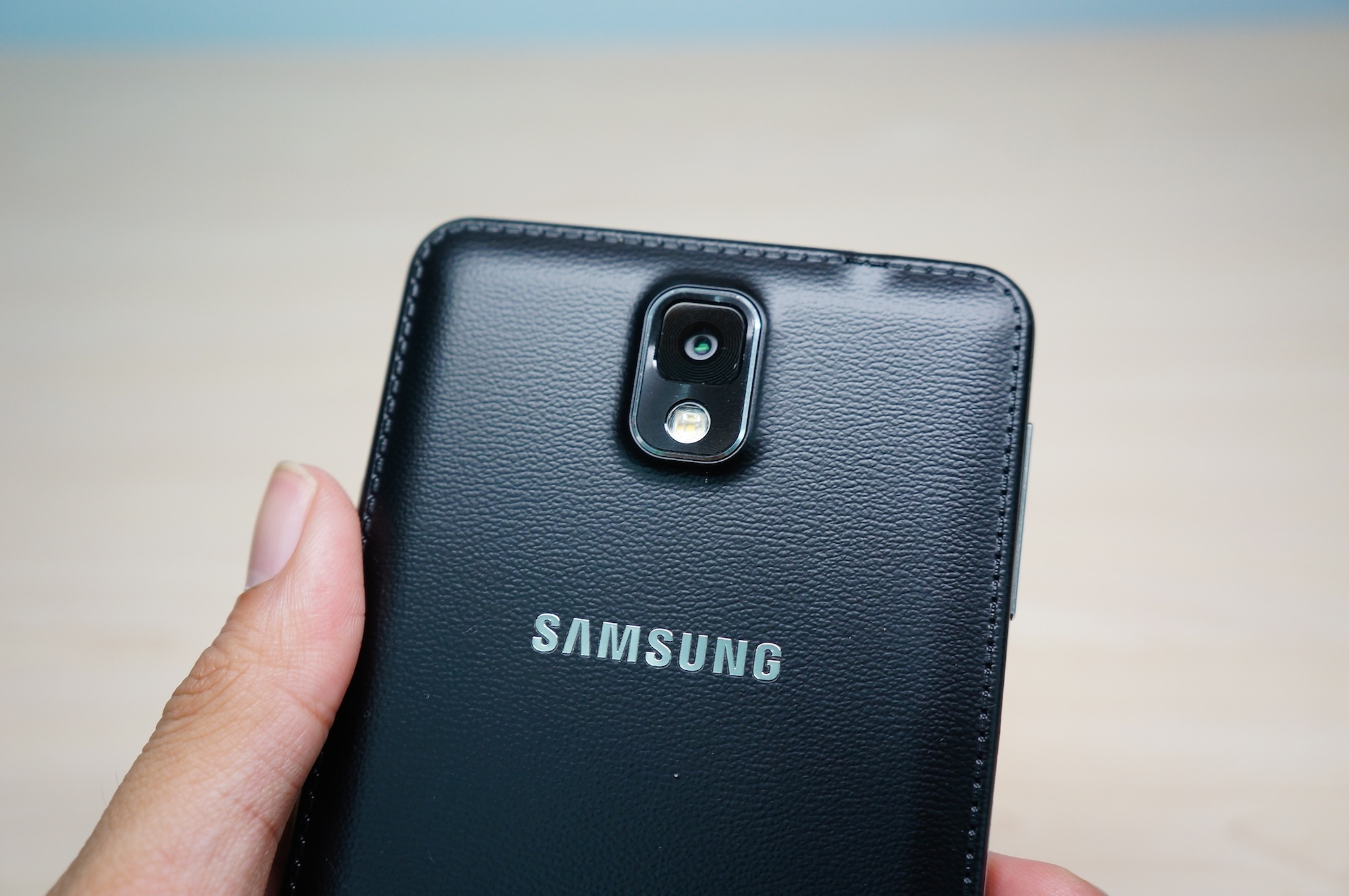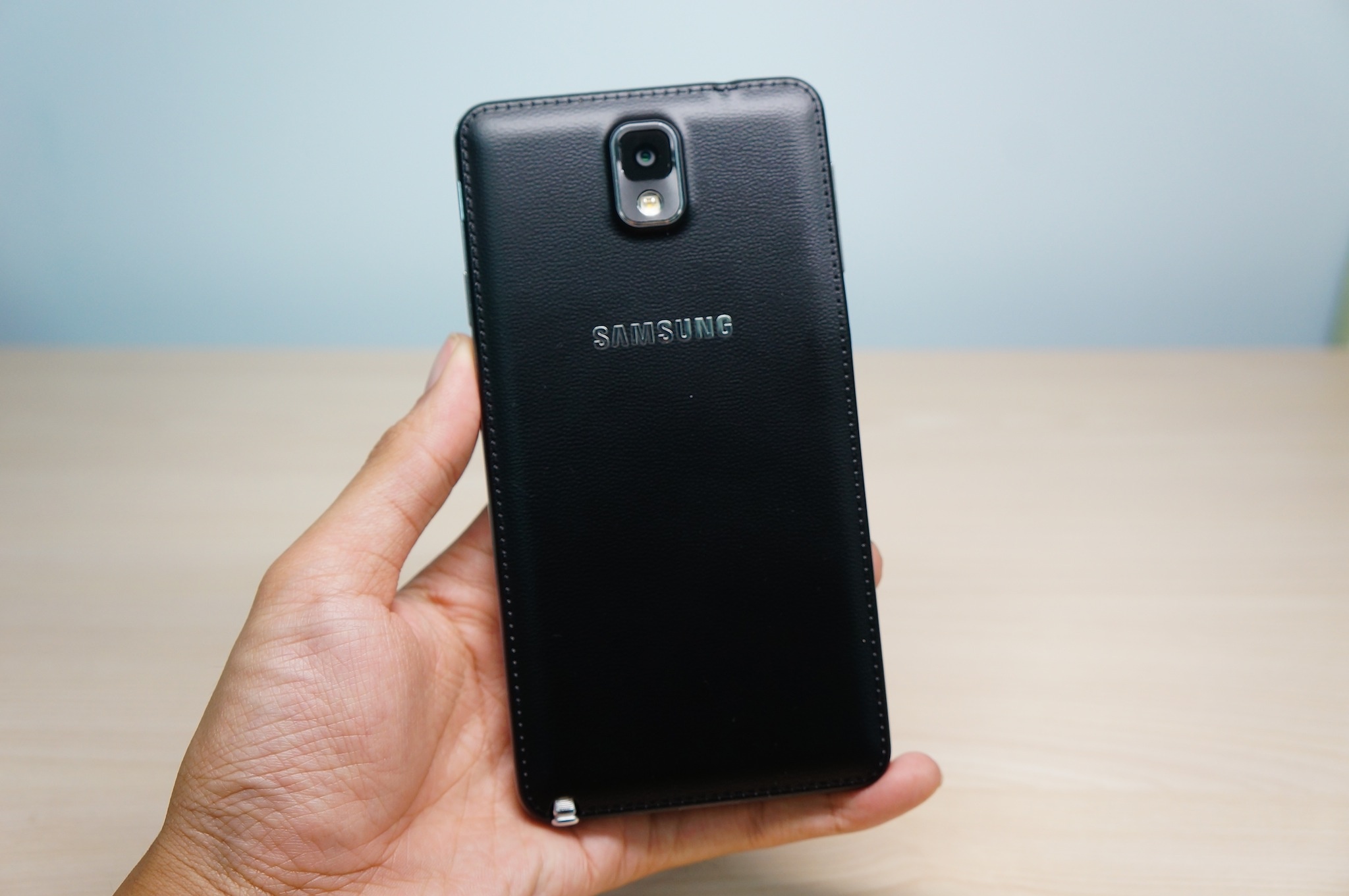 | Mặt sau của Note 3 là một lớp vỏ giả da với tùy chọn ba màu: đen, trắng, hồng. Đặc điểm này giúp cho Note 3 không bị mang tiếng sử dụng vỏ nhựa như Note 2. |