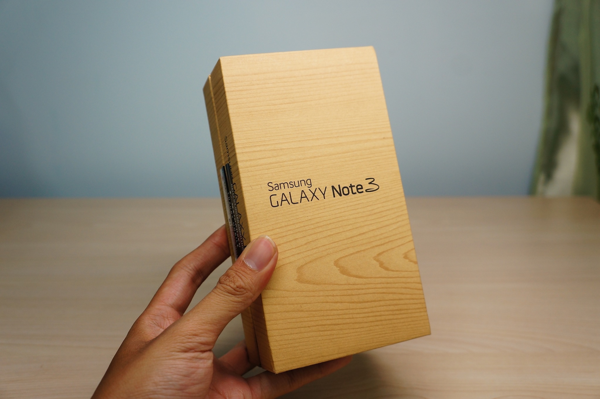 | Tương tự như những dòng smartphone Galaxy cao cấp, Note 3 cũng có hộp bằng cạc tông vân gỗ. |