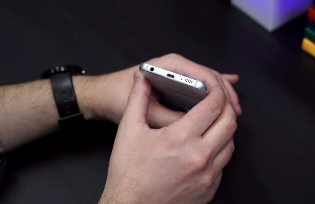 | Cạnh dưới được bo tròn và cách bố trí loa, cổng kết nối giống Galaxy S6. |
