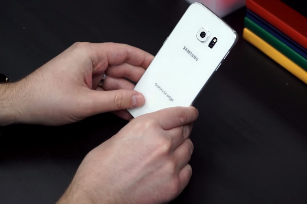 | Mặt sau của S6 Edge giống với Galaxy S6 với lớp kính cường lực, camera chính 16 MP và cảm biến đo nhịp tim. |