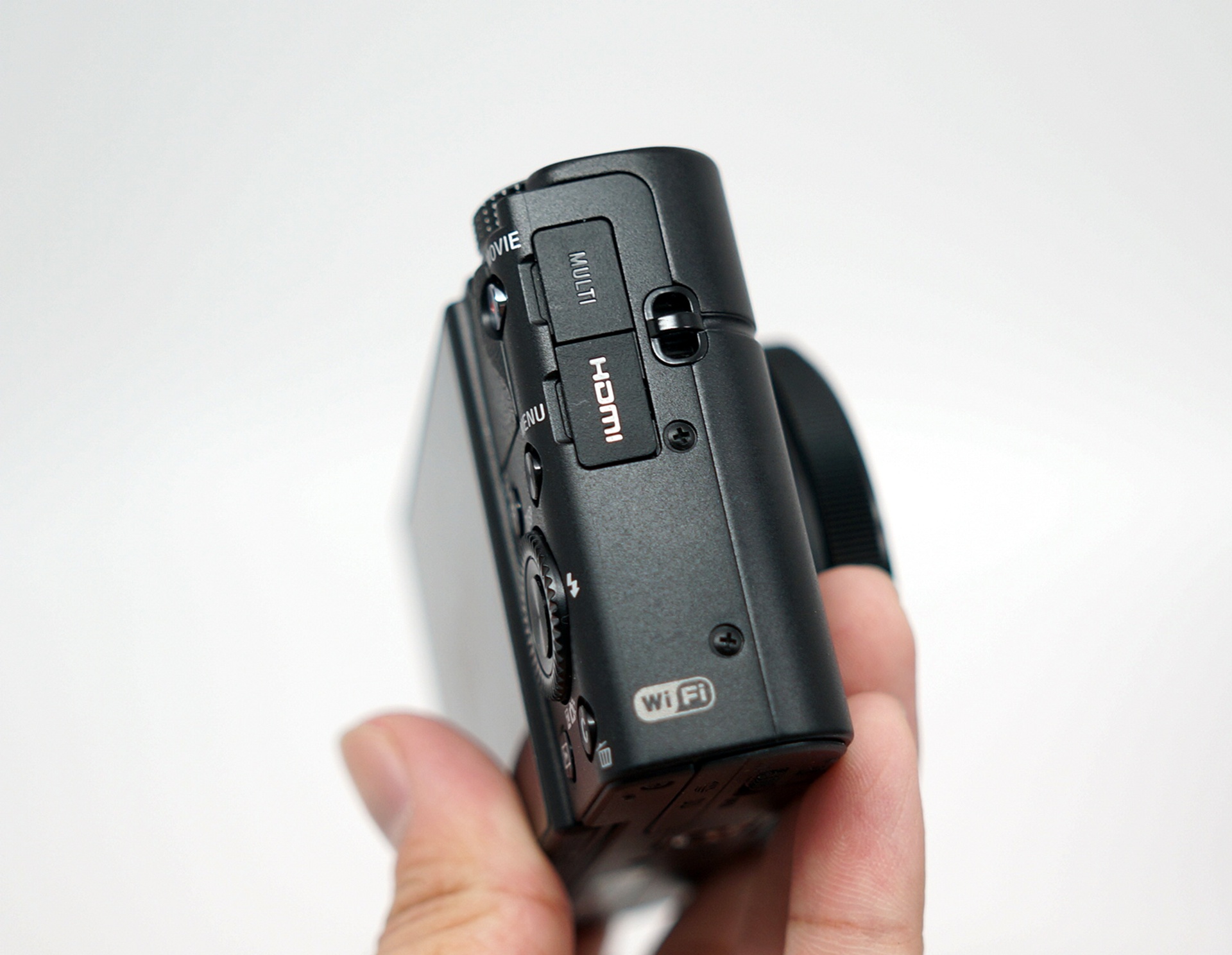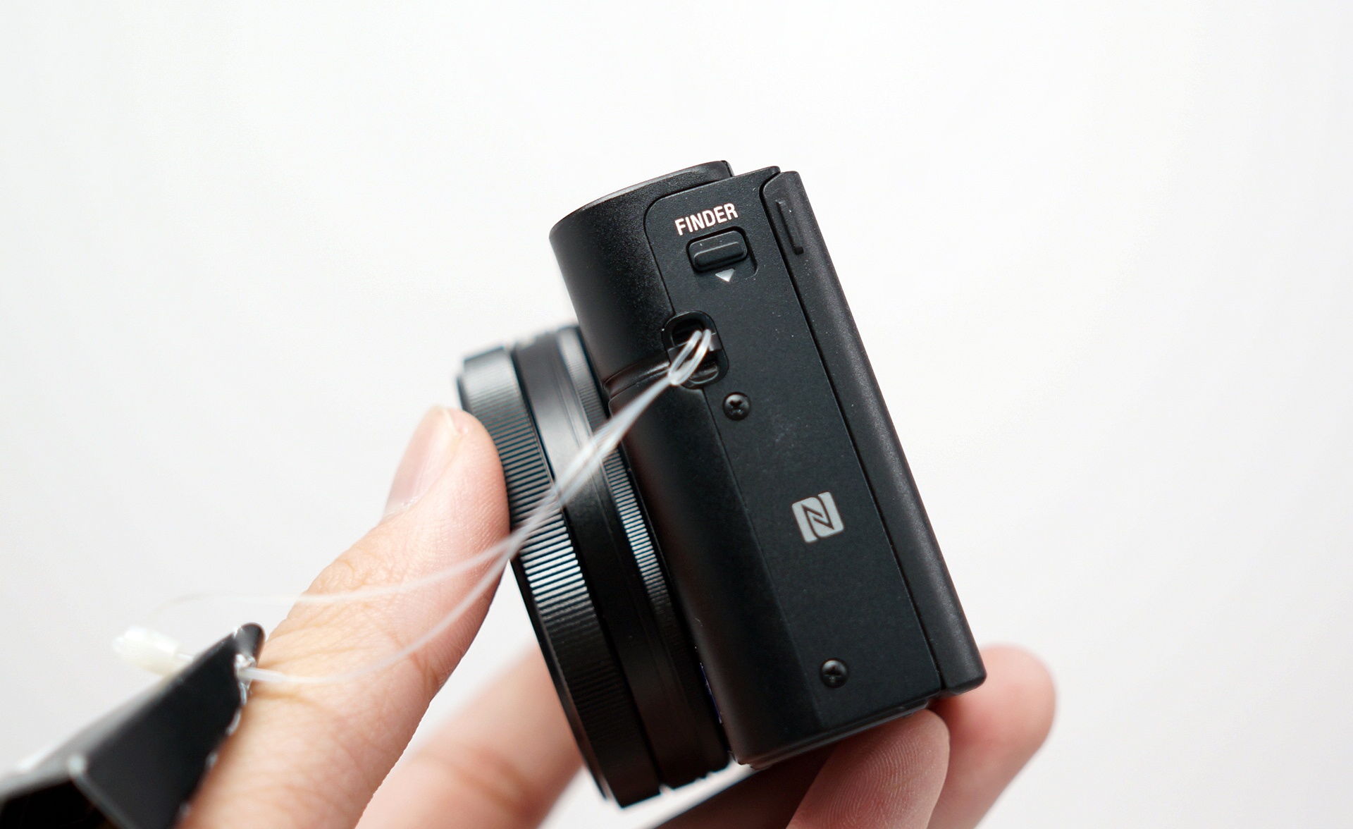 | Bên hông là chốt nhỏ để bật kính ngắm (finder). RX100 III được trang bị Wi-Fi Direct và NFC cho phép kết nối nhanh đến smartphone thông qua ứng dụng Play Memories trên Android hoặc iOS. |