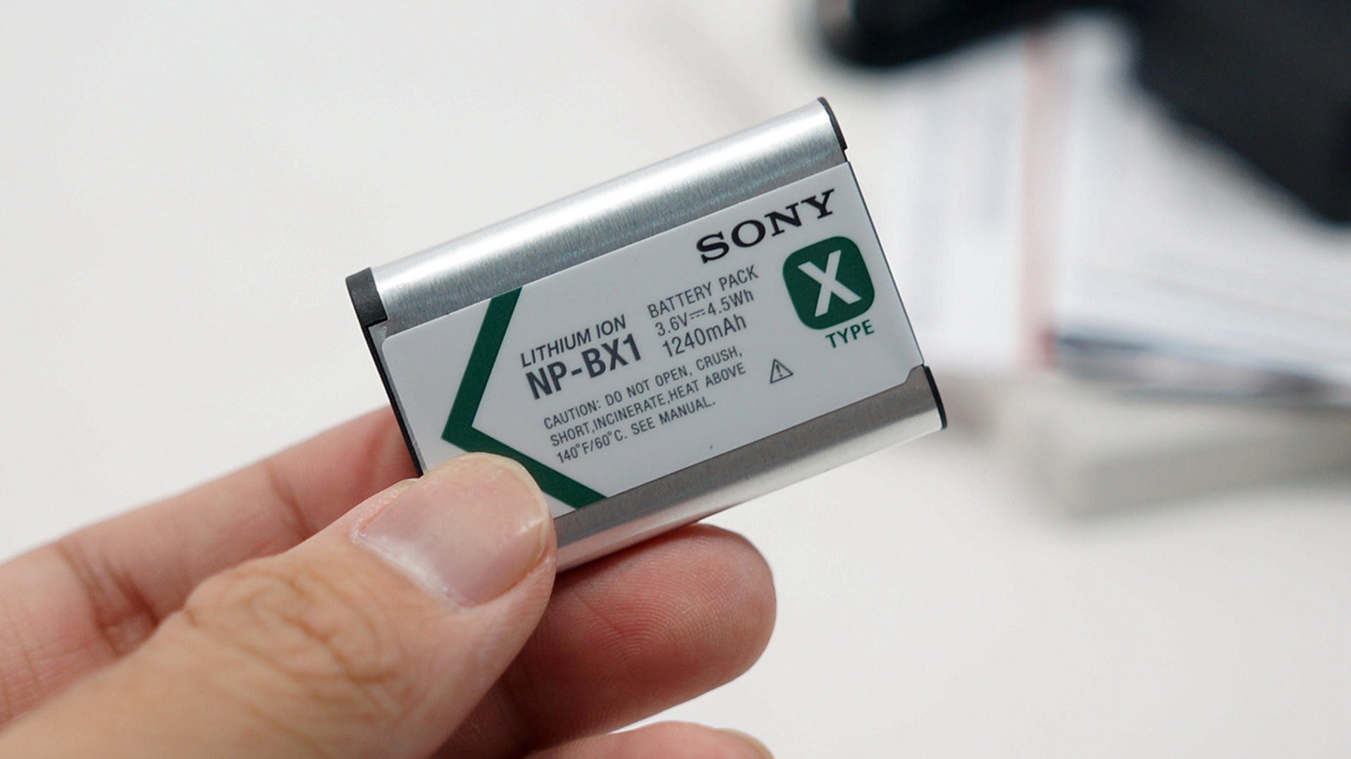 | Viên pin đi theo máy có hình dạng khá lạ mắt, thuộc series NP-BX1, dung lượng 1.240 mAh. |