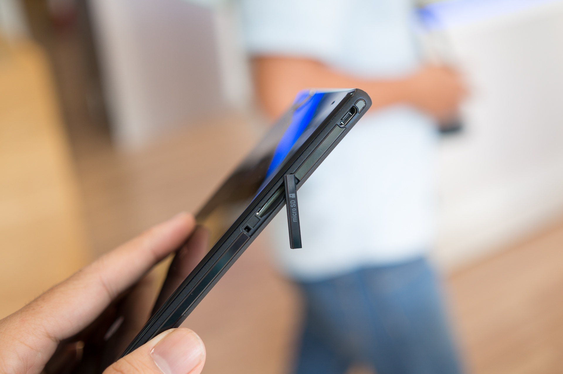 | Giắc cắm tai nghe và các khe cắm SIM ở cạnh phải, có nắp đậy chống nước. |