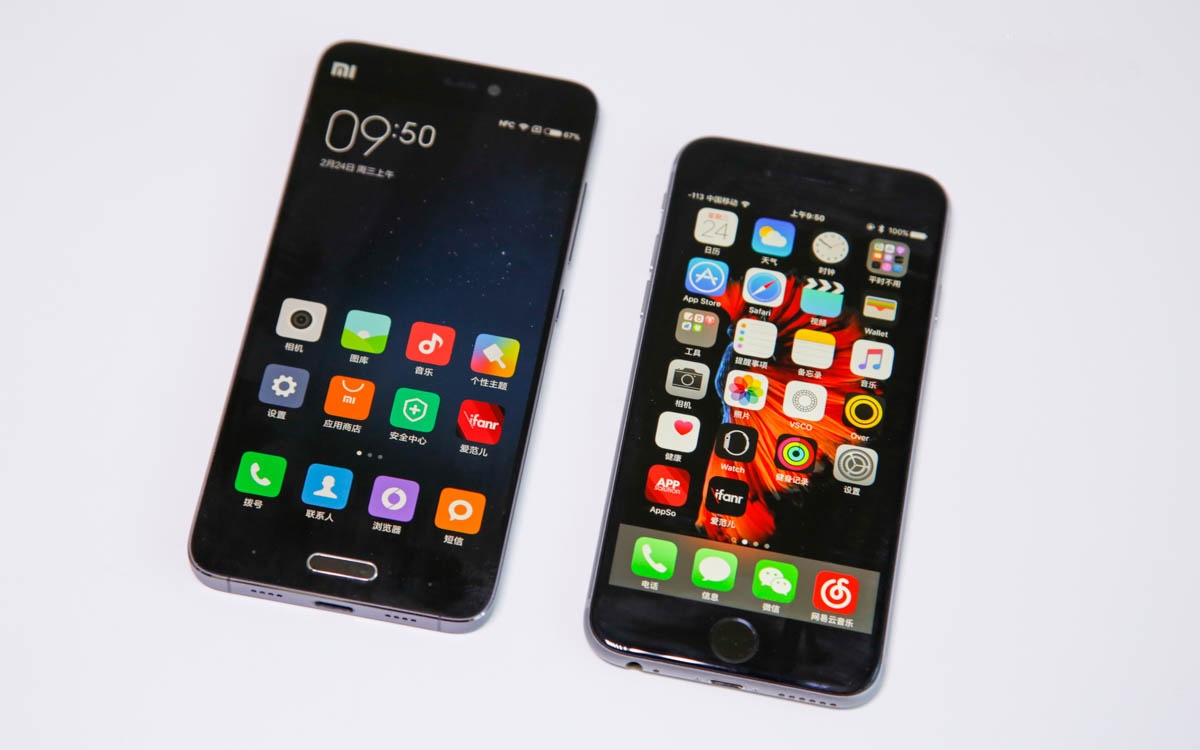 | Mi 5 so dáng với iPhone 6S. Nếu như một chiếc 6S bản tiêu chuẩn có giá bán 650 USD (mở mạng) thì giá của Mi 5 là 305 USD. |