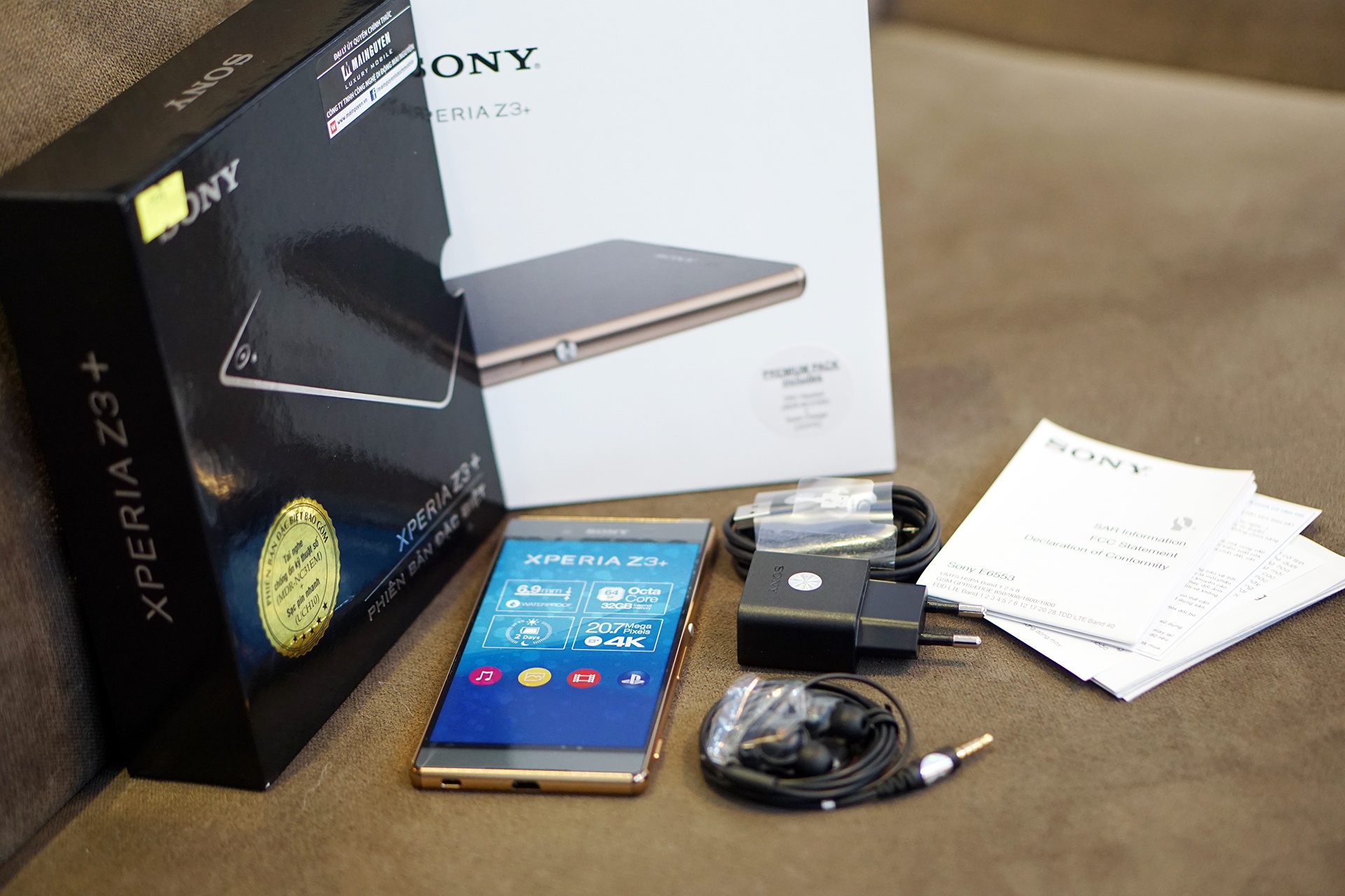 | Trong đợt hàng đầu tiên, Xperia Z3+ chỉ có phiên bản đặc biệt, tặng kèm nhiều phụ kiện hấp dẫn như cục sạc nhanh Quick Charger UCH10, tai nghe DNC Headset MDR- NC32EM, bao da cá sấu. |