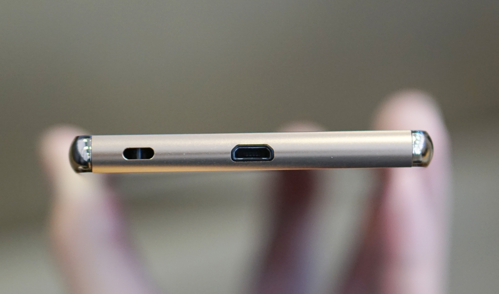 | Cạnh dưới chứa cổng MicroUSB và khe để đeo dây. |
