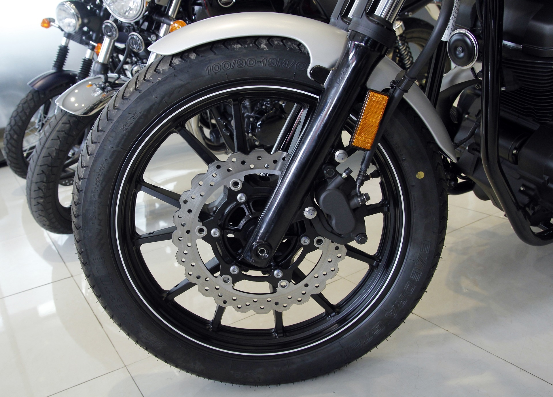 | Phanh trước sử dụng đĩa đơn, 298 mm, 2 piston. Phiên bản R-Spec được trang bị bánh xe có nhiều gai để tạo độ bám đường tốt. Lốp trước kích thước 100/90-19M/C 57H. |