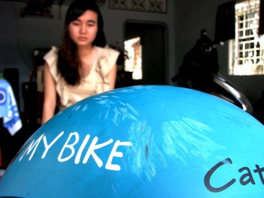 | Chiếc nón bảo hiểm bị trầy xước khi Kim Anh nhảy xuống đường. |