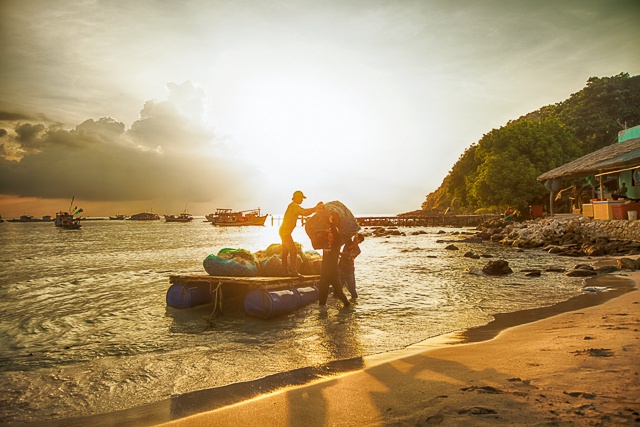 Rời Hòn Mấu, chúng tôi lên thuyền qua hòn Hai bờ đập. Con thuyền lướt sóng yên ả giữa những tia nắng cuối cùng, mang theo một màu vàng rực. Tới Hai bờ đập, mặt trời ngày càng xuống thấp. Do nước cạn quá, tàu không thể vào bờ được, chúng tôi đành lội nước, vận chuyển hành lý vào bờ. Sau gần 30 phút vật lộn với gió biển, cát ướt, chúng tôi cũng tới được bờ.