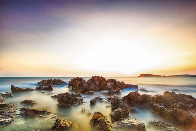 Thú vị nhất là khi nắng lên cao, ánh mặt trời chiếu xuống làn nước trong những khe đá, màu nước gặp ánh nắng phản chiếu với màu đen của đá thành trắng xóa, bàng bạc, nhìn từ xa hệt những làn khói trắng bay lơ lửng trên thiên đình như trong phim Tây Du Ký. Xa xa phía bờ là làn nước trong veo soi bóng những hòn sỏi nhiều màu sắc, nơi người ta chỉ muốn nằm dài ngâm mình ngắm nhìn cây cối xanh mướt cùng những tán lá dừa bay bay trong gió.
