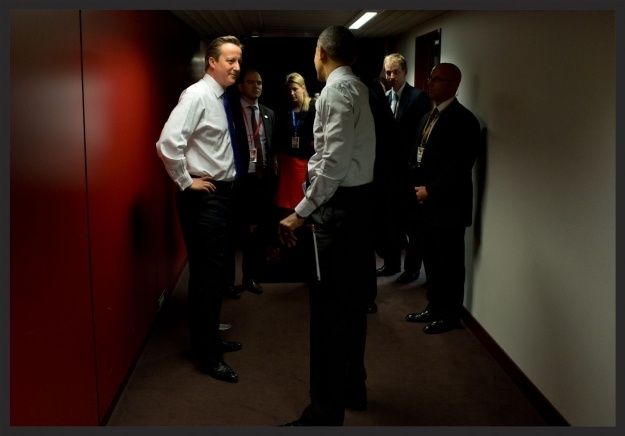 Tổng thống Obama đang nói chuyện cùng Thủ tướng Anh David Cameron sau một cuộc họp song phương bên lề hội nghị G7 được tổ chức tại thành phố Brussels, Bỉ ngày 5/6. Ảnh: White House