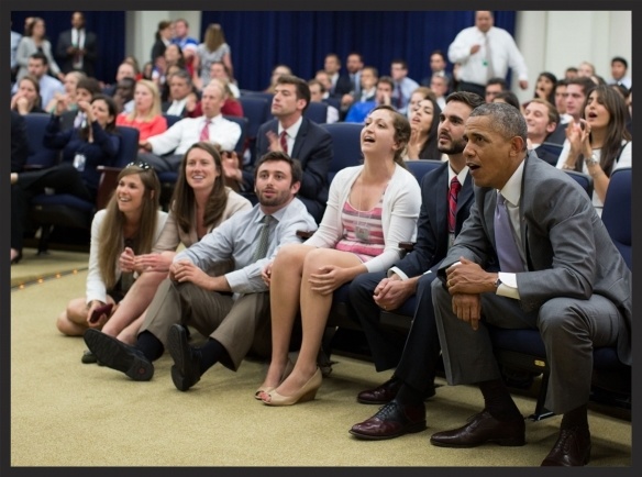Tổng thống Obama và các nhân viên chăm chú theo dõi bóng đá giữa đội tuyển Mỹ và Bỉ trong giải Vô địch Thế giới tại tòa nhà văn phòng điều hành Eisenhower, Nhà Trắng ngày 1/7. Ảnh: White House