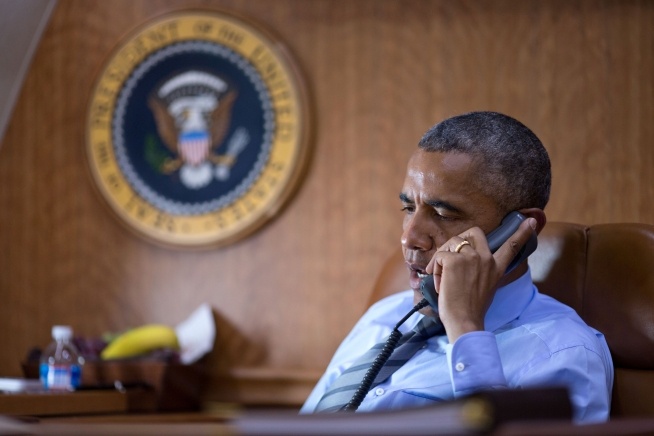 Tổng thống Obama đang nói chuyện từ trên một phi cơ thuộc đội Không lực số một với Tổng thống Ukraine, Petro Poroshenko, về chuyến bay của hãng Malaysia Airlines gặp nạn tại miền đông Ukraine, ngày 17/6. Chính quyến Kiev và phe ly khai đã liên tiếp đổ lỗi cho nhau về vụ việc và càng khiến cho chia rẽ tại quốc gia Đông Âu trở nên sâu sắc. Ảnh: White House