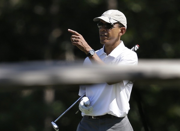 Tổng thống và gia đình có kỳ nghỉ kéo dài hai tuần tại đảo Martha's Vineyard, bang Massachusetts. Tại đây, ông Obama đã chơi golf cùng cựu ngôi sao bóng rổ NBA Alonzo Mourning ngày 10/8. Ảnh: Mnews