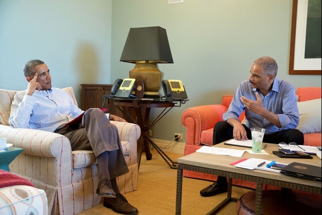 Tổng thống Barack Obama đang bàn luận với Bộ trưởng Tư pháp Eric Holder về tình hình tại thành phố Ferguson trong khi dừng nghỉ tại thị trấn Chilmark, đảo Martha's Vineyard, ngày 14/8. Vụ việc một viên cảnh sát da trắng bắn chết một thanh niên da đen tại đây đã gây nên một làn sóng phẫn nộ khắp nước Mỹ. Ảnh: White House