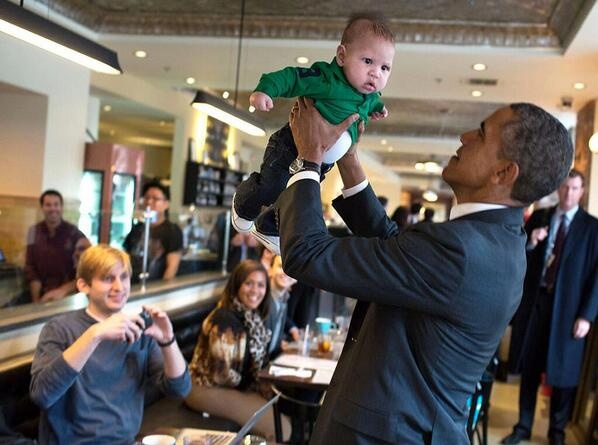 Tổng thống Obama bế một em bé và nói chuyện với người dân trong một lần dừng chân ăn trưa tại cửa hàng The Coupe, thủ đô Washington, D.C., ngày 10/01. Ảnh: White House