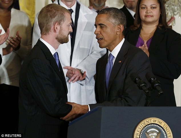 Tổng thống Obama đang trực tiếp bắt tay bác sĩ Ken Brantly, người đã được điều trị hoàn toàn khỏi bệnh dịch Ebola, trong buổi tiếp đón và cám ơn đội ngũ nhân viên y tế và tình nguyện viên Mỹ làm việc tại khu vực dịch bệnh ở các quốc gia Tây Phi. Ảnh: Reuters