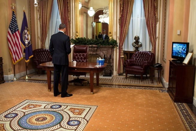 Ông Obama đang xem lại lần cuối bài diễn thuyết trước khi tuyên bố bản Thông điệp liên bang trước Quốc hội Mỹ tại Nhà Trắng ngày 28/1. Ảnh: White House