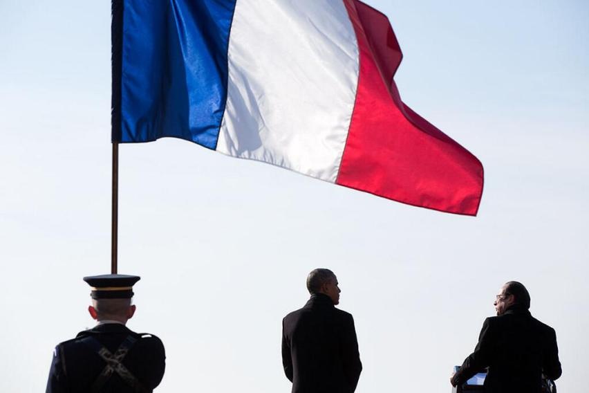 Một vệ binh đang cầm quốc kỳ Pháp trong khi Tổng thống Obama lắng nghe lời phát biểu của người đồng cấp, Tổng thống Pháp François Hollande, trong buổi tiếp đón cấp quốc gia được tổ chức tại khu vườn phía nam của Nhà Trắng ngày 11/2. Ảnh: White House