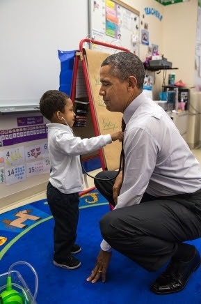 Một em nhỏ đang dùng ống nghe và chơi đùa cùng Tổng thống Obama trong một lần ông viếng thăm trường tiểu học Powell, thủ đô Washington, D.C., ngày 4/3. Ảnh: White House