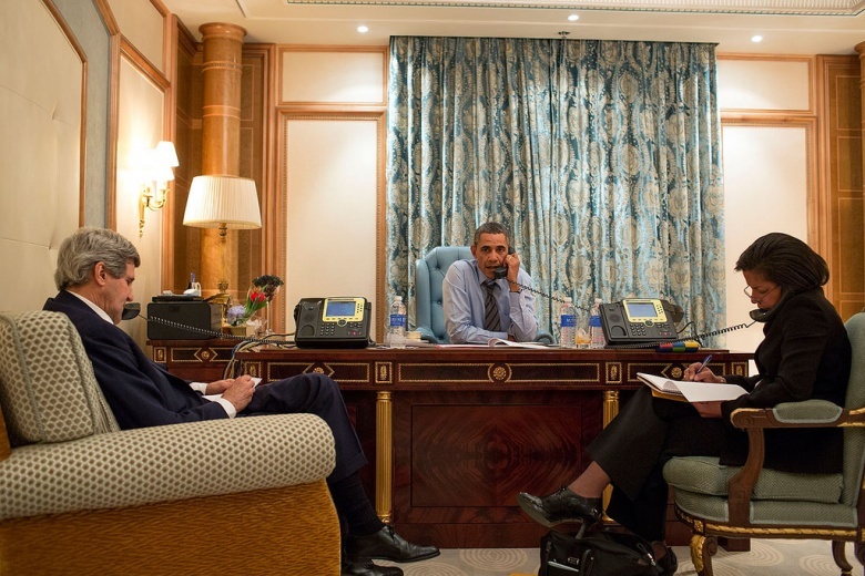 Trong khi dừng chân tại Riyadh, Saudia Arabia, Tổng thống Obama đã nói chuyện và thảo luận về các vấn đề với ông Putin qua điện thoại. Ngồi bên cạnh ông là Ngoại trưởng Mỹ, John Kerry và cố vấn An ninh quốc gia, bà Susan Rice, ngày 28/3. Ảnh: White House