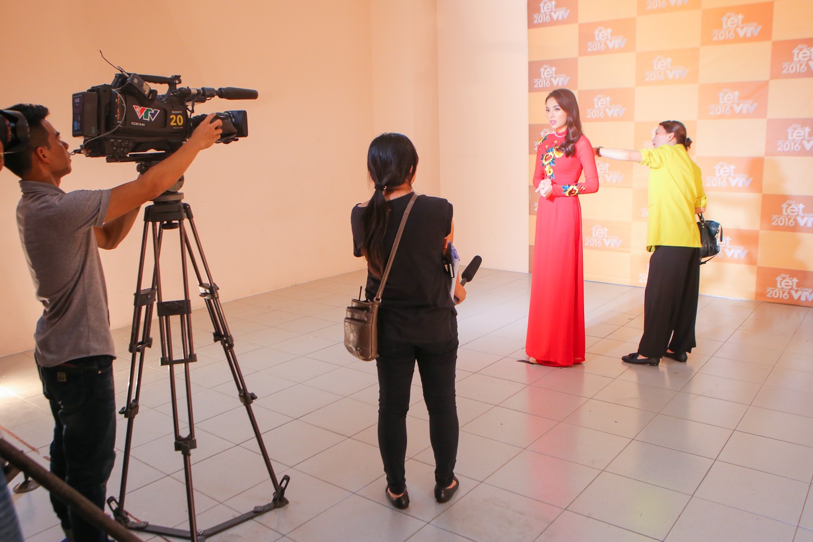 Tông trang điểm trẻ trung, nữ tính phù hợp áo dài bắt mắt. Thiết kế điểm hoa thêu ở ngực duyên dáng. Bỏ qua bữa trưa, hoa hậu và mẹ đến thẳng trường quay của VTV để kịp thời gian đã hẹn.