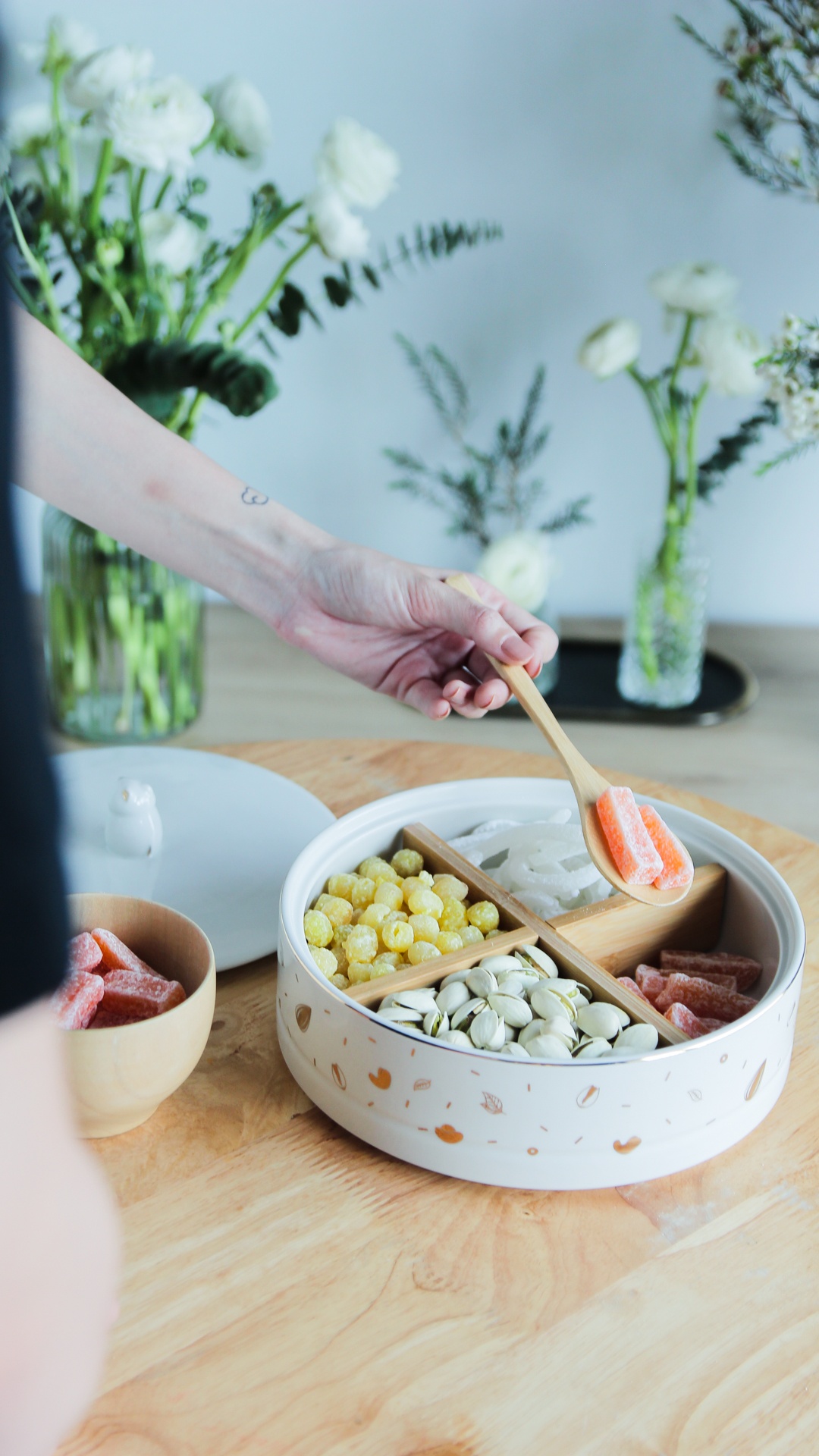 | Đây là năm đầu tiên chúng tôi đón Tết ở nhà riêng nên rất háo hức chuẩn bị khay mứt. Hai vợ chồng chọn các loại hạt và hoa quả sấy khô làm món ăn vặt ngày Tết. |