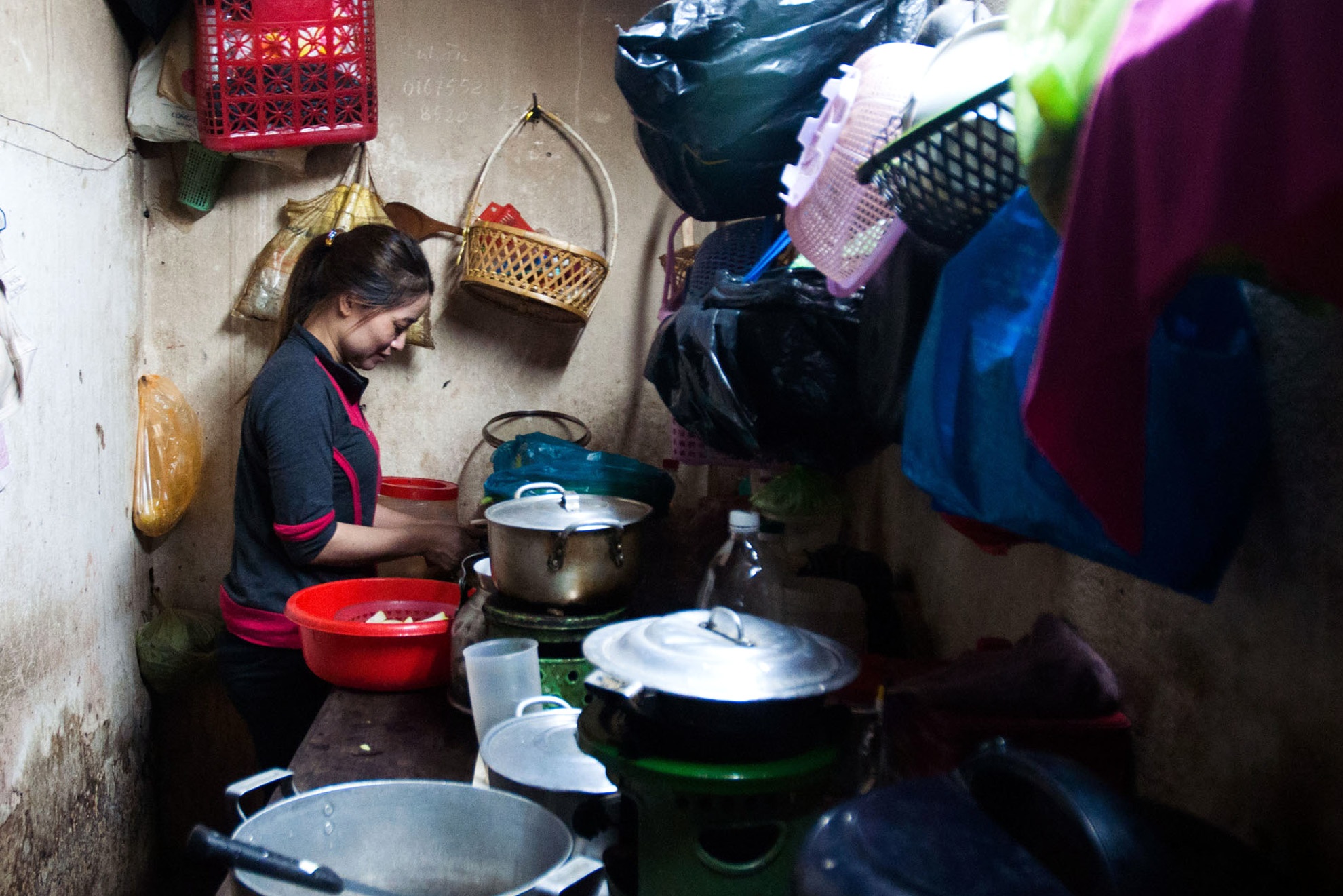 | Khu bếp khá chật nên mọi người phải nhường nhau nấu ăn. Hôm nay chị Hồng được ưu tiên nấu trước để 2 con được ăn cơm sớm. |