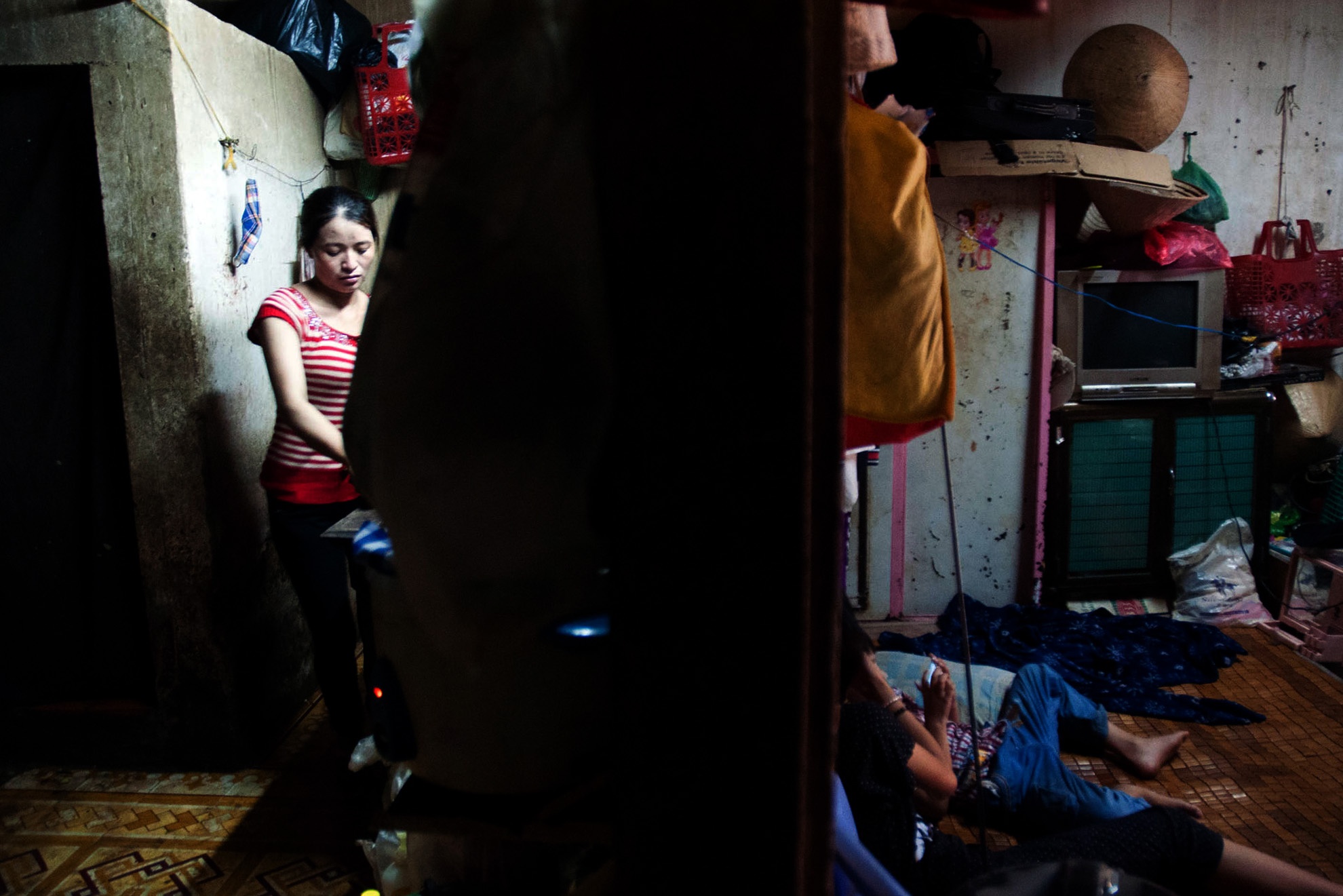 | Bữa cơm của ba mẹ con trên chiếc bàn kê ngay góc giường. Căn nhà chị ở là vựa ve chai, được chủ cho thuê với giá 50.000 đồng/người/tháng. Chị và chồng ngủ dưới tầng trệt cạnh nhà vệ sinh, các sinh hoạt rất bất tiện. Từ khi 2 con vào chơi, gia đình 4 người nằm chen nhau trên chiếc giường nhỏ, ve chai chất đầy xung quanh. Chị nói, sau khi nhận được 5 triệu yen, 4 người sẽ về quê chơi thăm hàng xóm và sửa sang lại nhà cửa. Sau đó, anh chị lại tiếp tục vào Sài Gòn hành nghề ve chai, gửi con cho bà ngoại trông nom. |