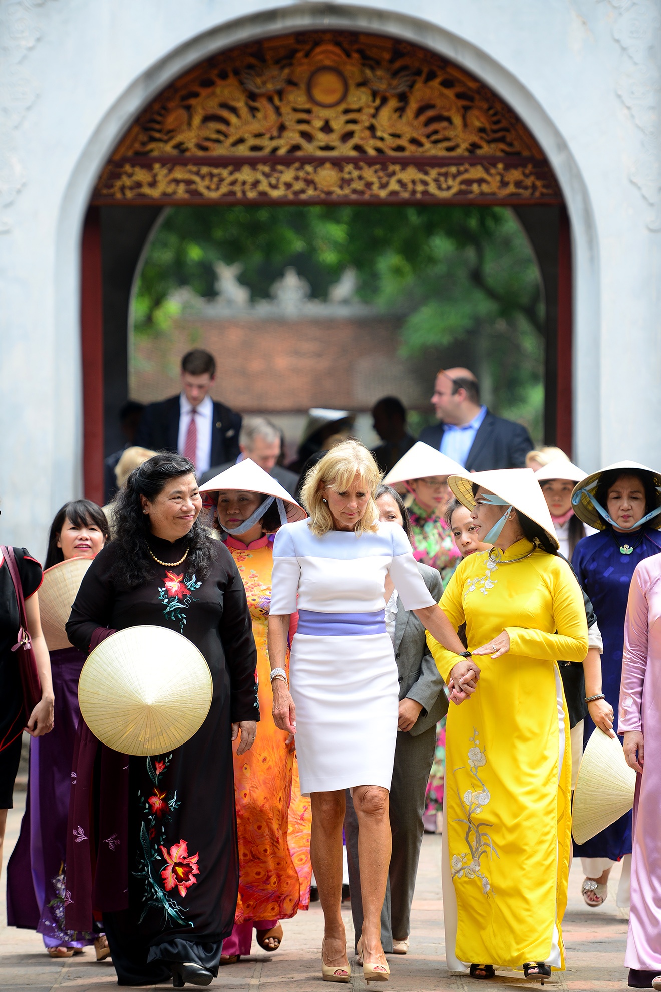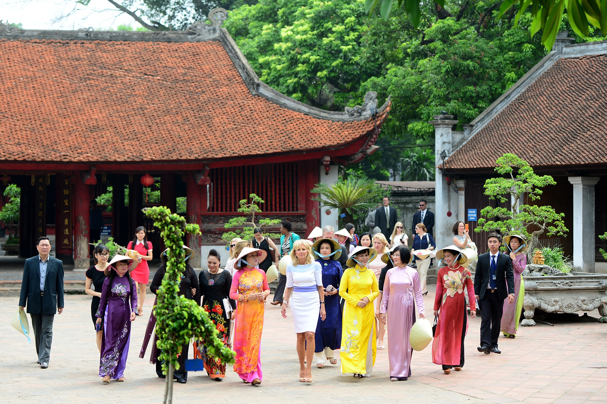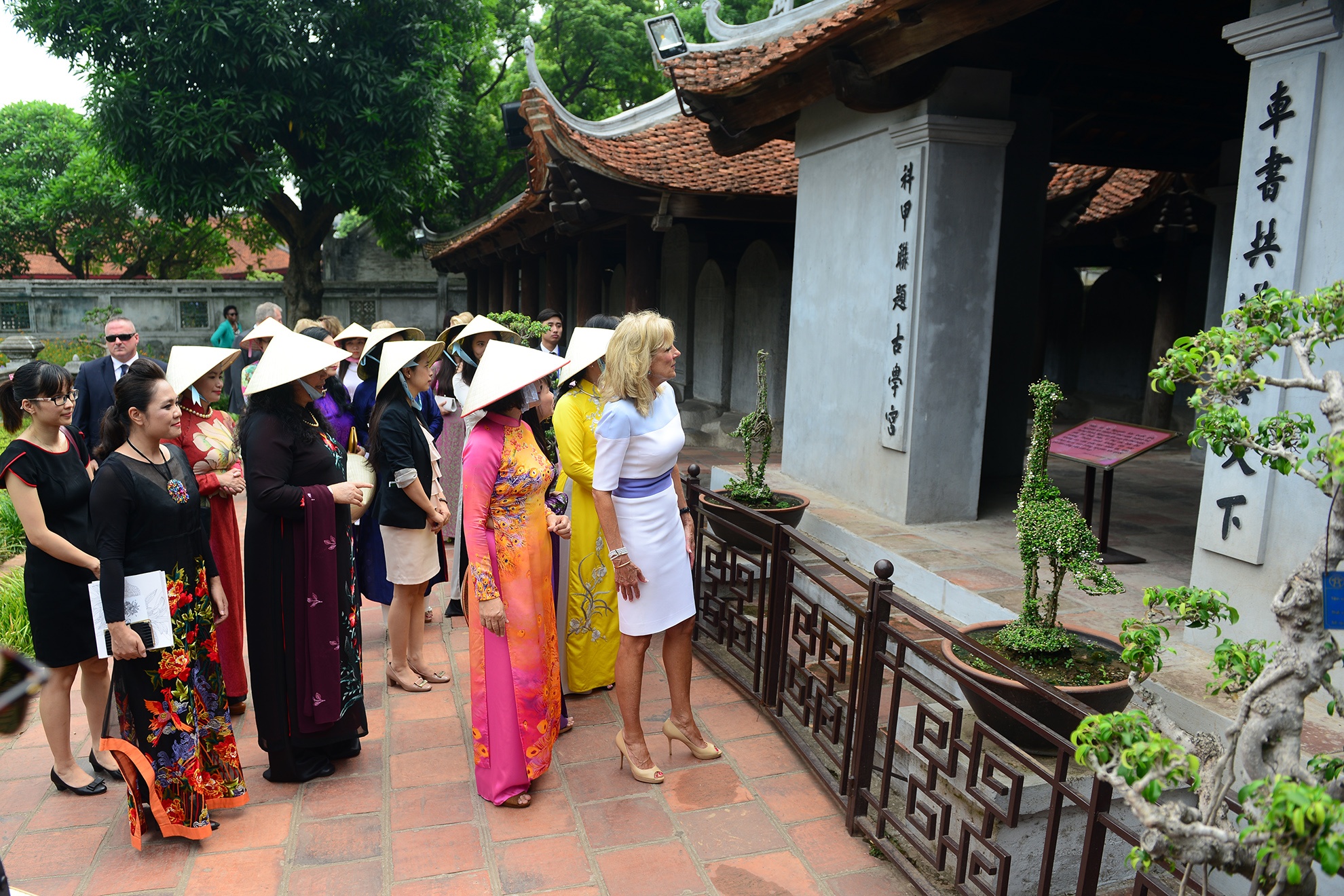Sáng 20/7, bà Jill Biden (áo trắng), phu nhân của Phó tổng thống Mỹ Joe Biden, tới Văn Miếu - Quốc Tử Giám. Hà Nội là điểm dừng chân thứ hai trong chuyến công du châu Á của tiến sĩ Jill Biden. Bà tới Hàn Quốc, Việt Nam và Lào nhằm kêu gọi các đối tác chính phủ và xã hội tham gia những vấn đề liên quan đến tăng cường các cơ hội giáo dục và kinh tế cho phụ nữ.