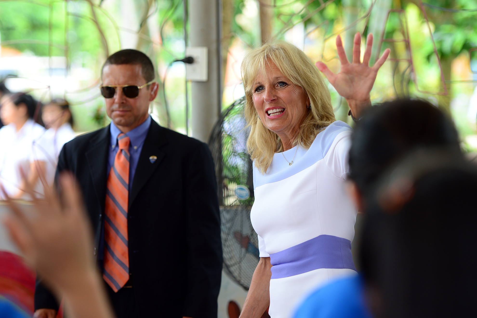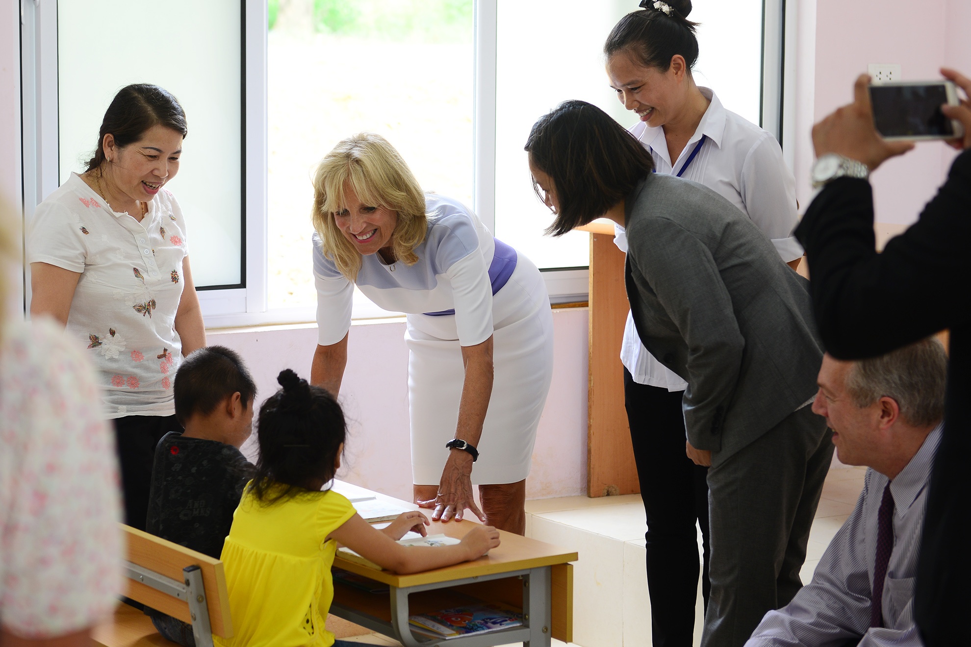 Đệ nhị phu nhân Mỹ trò chuyện với các em nhỏ và nói rằng bà cũng là một giáo viên nên hình ảnh các em nhỏ ở đây khiến bà nhớ đến học sinh của bà. "Tôi mong các em ở đây học thật giỏi và cảm ơn các thầy cô và các em đã dành cho chúng tôi sự chào đón nồng nhiệt", bà Biden nói. Đệ nhị phu nhân Mỹ từng giảng dạy tiếng Anh trong các trường trung học và đại học. Bà có bằng tiến sĩ tại Đại học Delaware. Từ năm 2009, bà trở thành giáo sư về tiếng Anh tại Đại học Cộng đồng Bắc Virginia.