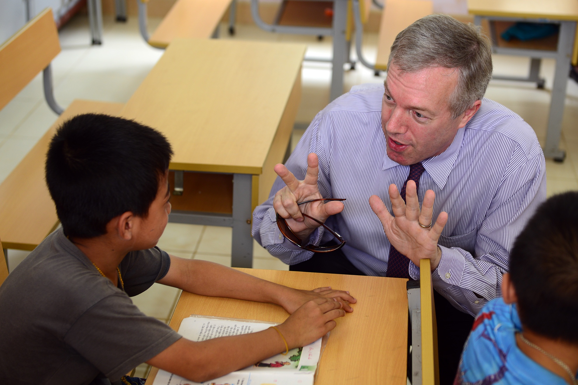 Đại sứ Mỹ tại Việt Nam, ông Ted Osius, trò chuyện với một em bé 8 tuổi bằng tiếng Việt. Ông là một trong những người tháp tùng đệ nhị phu nhân Mỹ trong chuyến thăm.