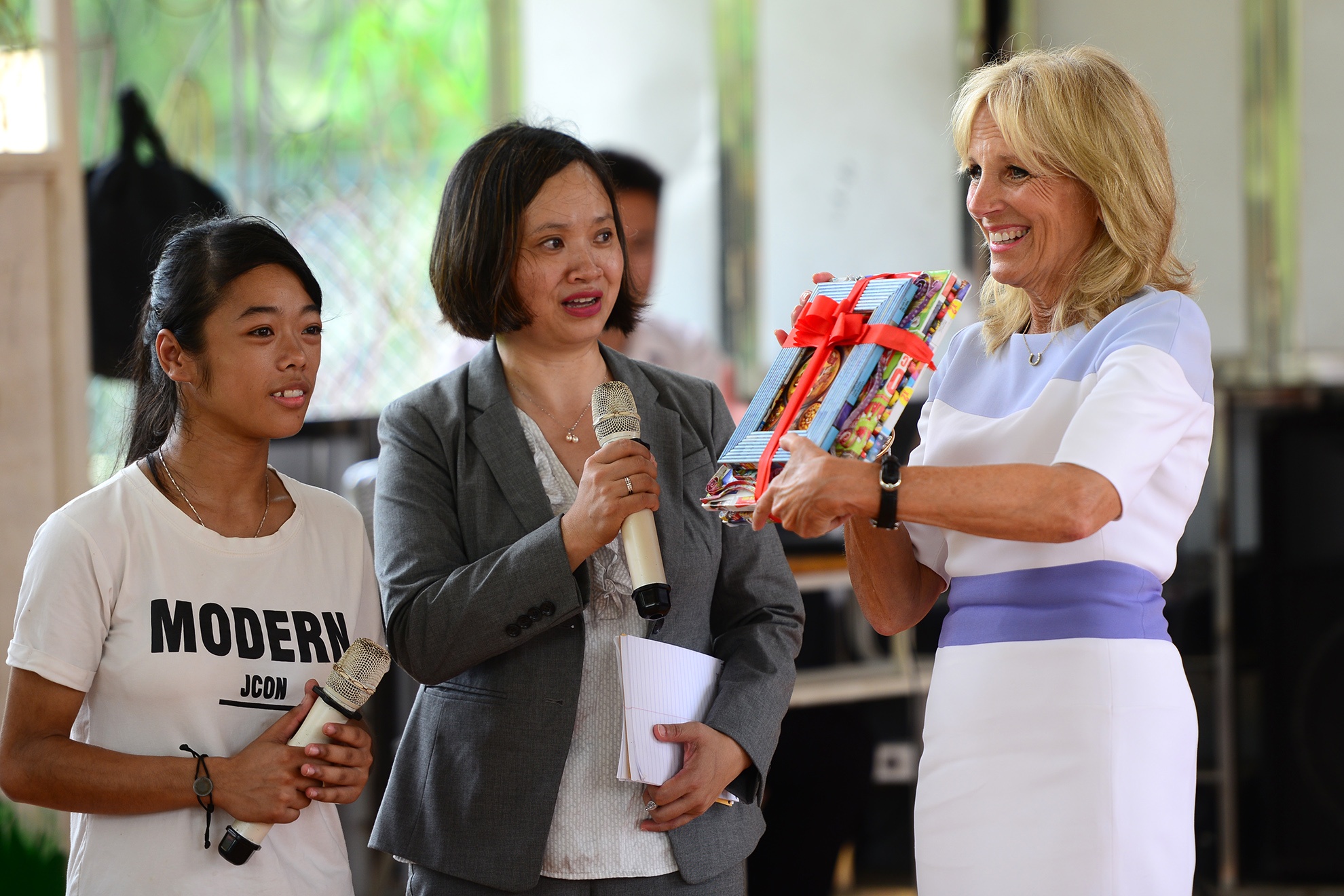 Bà Biden giơ cao món quà do một em đại diện cho học sinh của trung tâm trao tặng. Em học sinh cho biết, các em tự làm món quà trong dịp nghỉ hè và gửi tặng đệ nhị phu nhân của nước Mỹ với tình cảm trân trọng nhất.