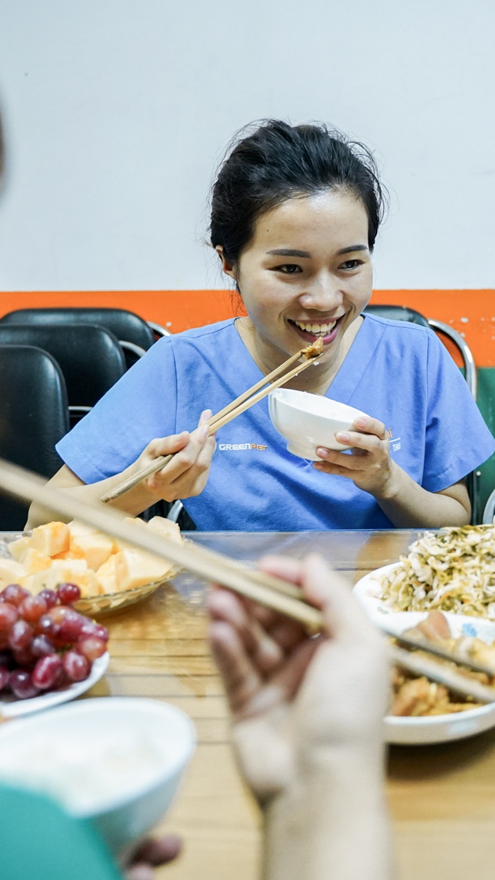 | 11h45, tôi nghỉ ăn trưa cùng đồng nghiệp. Chúng tôi thường đem đồ tới, phân công thay nhau nấu rồi ăn chung. Bệnh viện tôi có khoảng hơn 10 người làm việc theo ca, sáng 8h-17h30, chiều 13h30-22h, đêm 22h-8h hôm sau. |