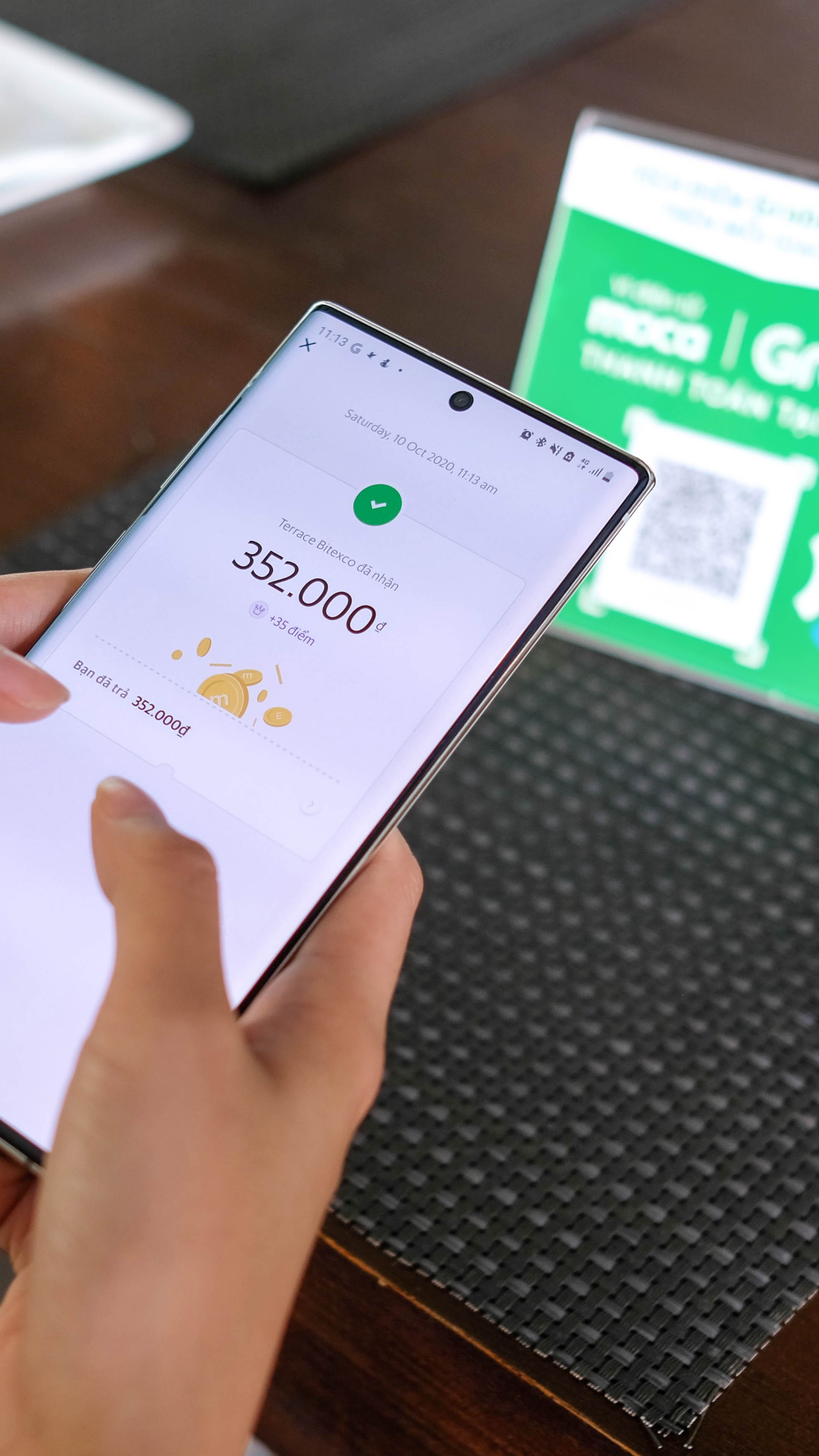 Chúng tôi hẹn nhau tại một quán cà phê ở trung tâm quận 1. Quán nằm trong chương trình ưu đãi của Grab nên khi thanh toán bằng ví Moca, tôi được hoàn 40.000 đồng về ví.