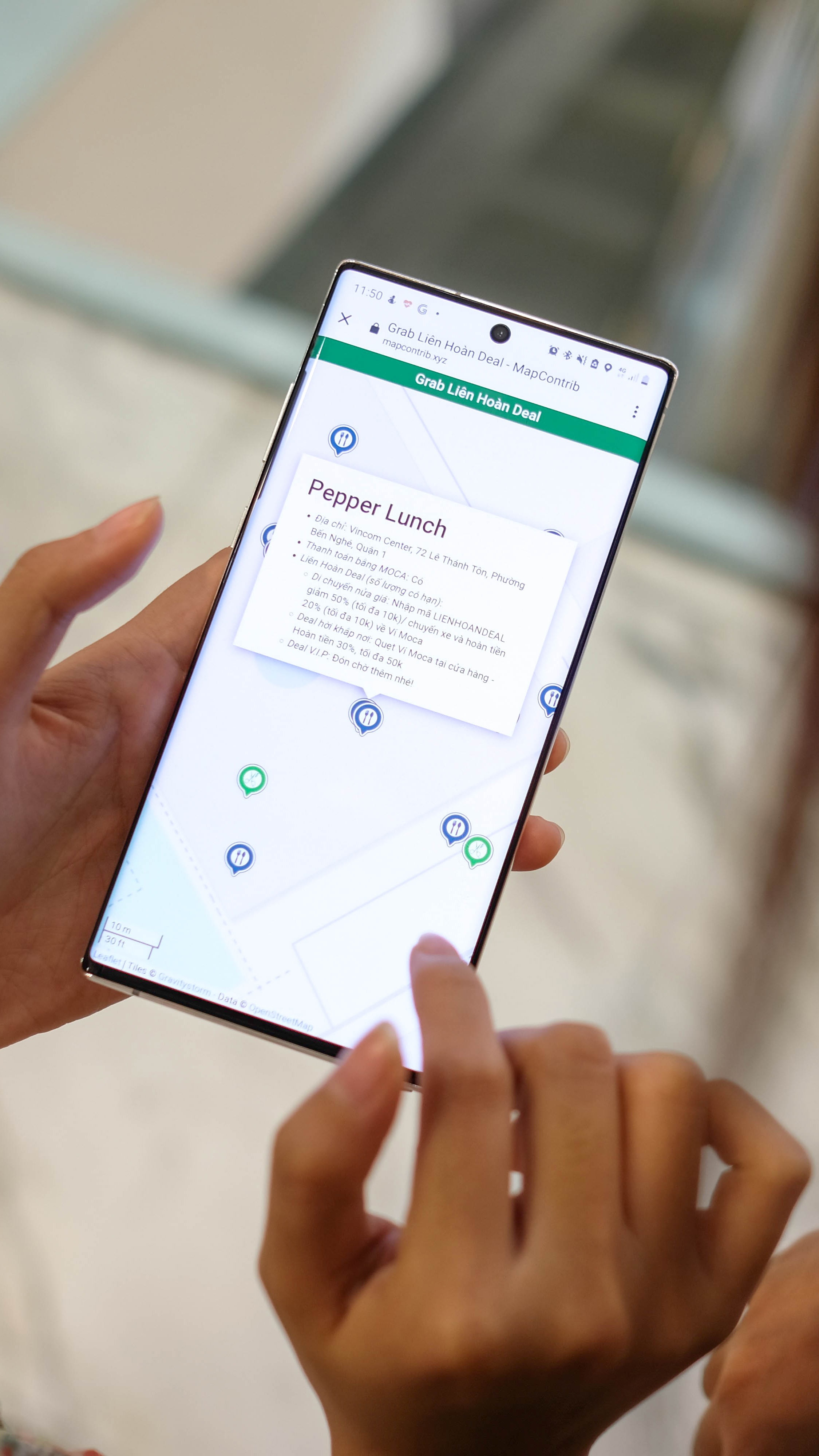 | Trong lúc chờ đợi xe đến, chúng tôi lại vào bản đồ Grab Liên hoàn deal và chọn quán ăn trưa sau khi mua sắm. Chương trình này áp dụng cho rất nhiều nhà hàng như King BBQ hay Pepper Lunch. |