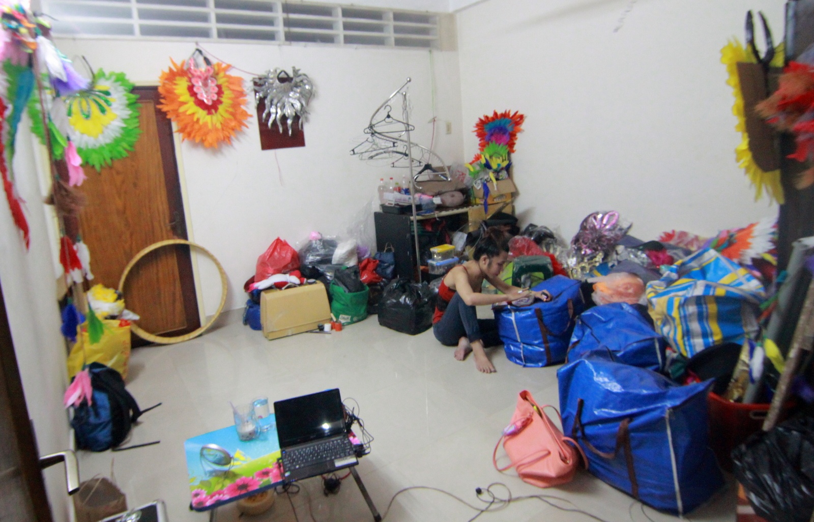 | Có khi phòng ngổn ngang đồ, các thành viên ra bên ngoài hành lang tập múa, hát. Cô chia sẻ dự định sẽ thuê một địa điểm rộng hơn để tập luyện. |