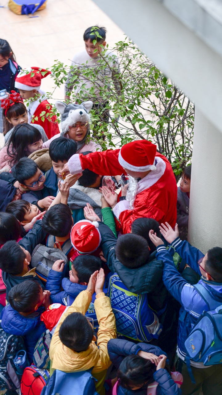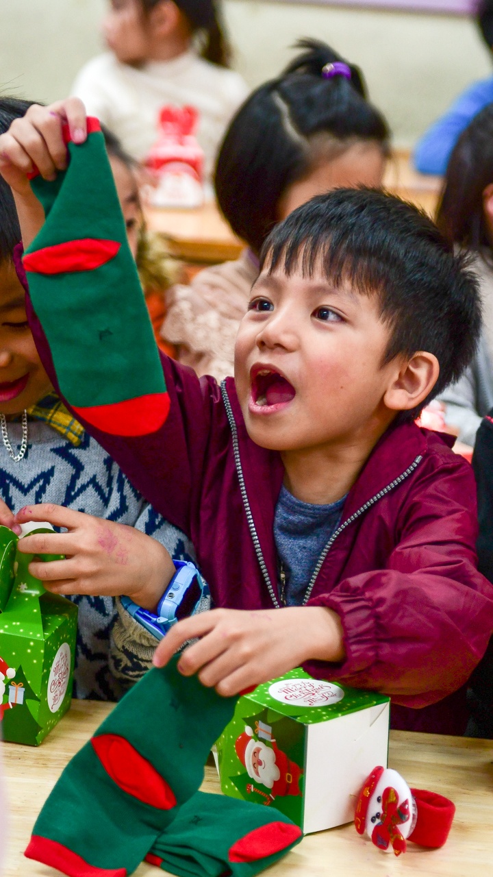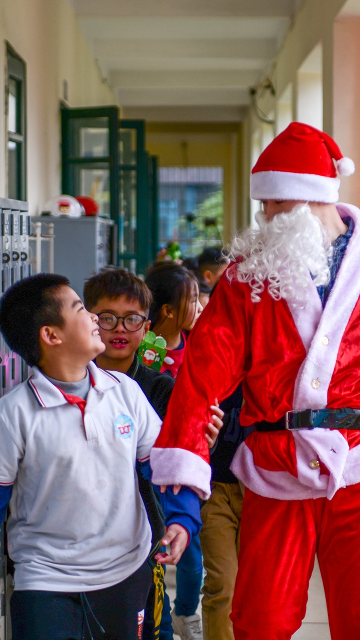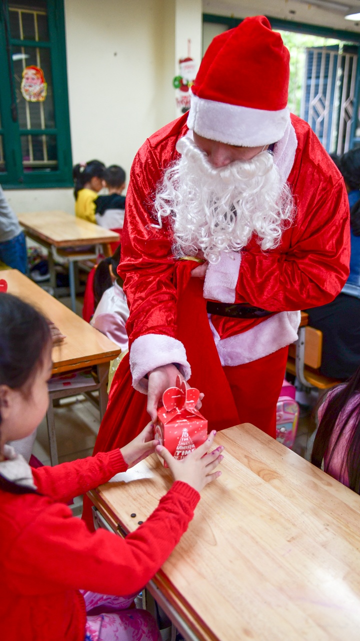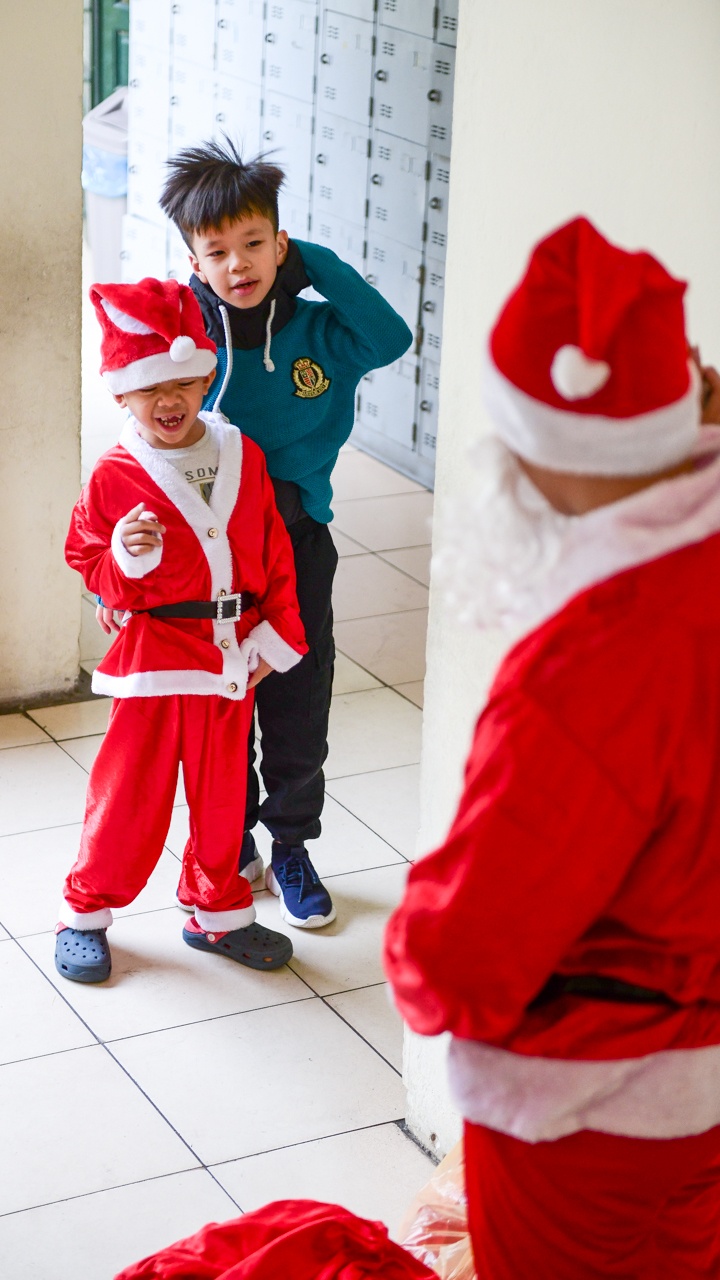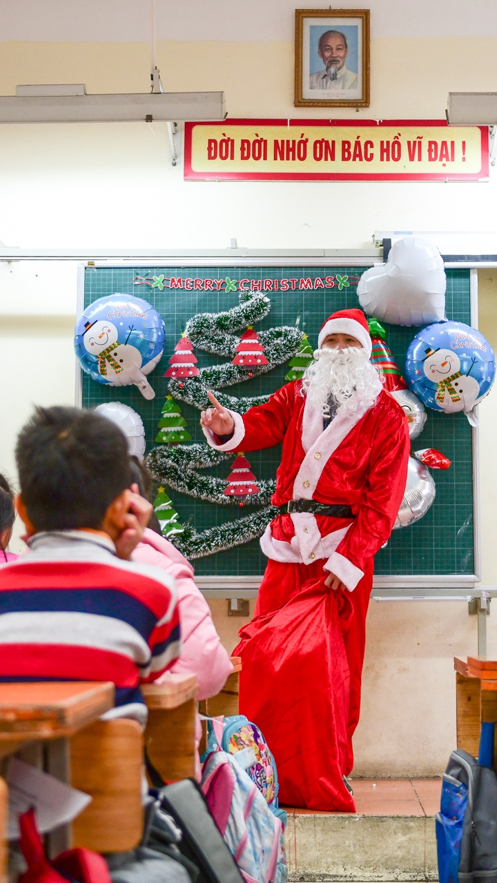 | Tôi chào cả lớp rồi đến mỗi bàn, đập tay với từng em. Lũ trẻ hiếu động, tôi phải nhờ đến cô giáo giúp ổn định trật tự. Cả lớp đồng thành hô "Có" khi tôi hỏi có muốn được ông già Noel phát quà không. |