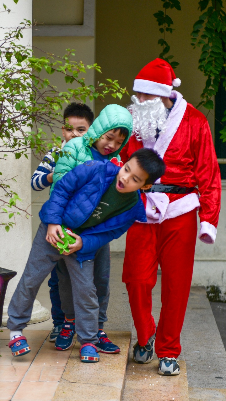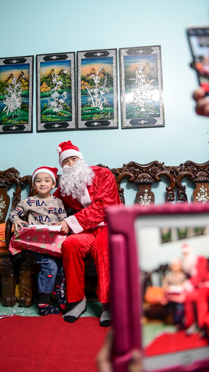 | Vài em tinh nghịch tranh chỗ đứng cạnh ông già Noel lúc chụp ảnh. Một cậu bé thậm chí còn vươn tay giật bộ râu giả tôi đang đeo, trêu chọc “Sao ông già Noel lại trẻ thế?”. |