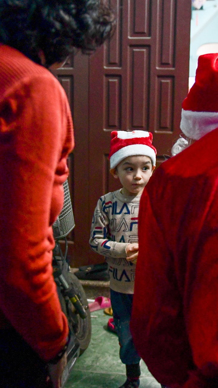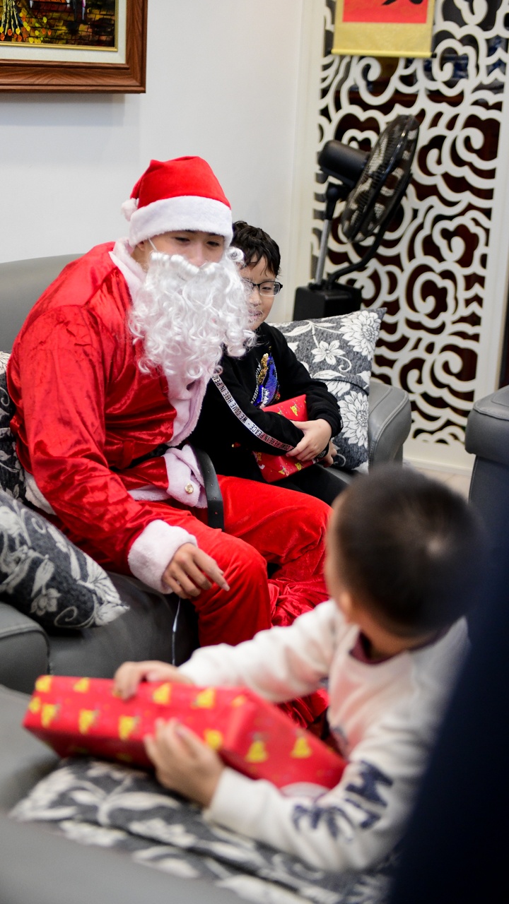 | Sau khi kết thúc việc tặng quà ở trường học, tôi nhanh chóng đến nhà một “vị khách nhí”. Đó là một em bé lai tên Jack. Cậu bé nhận ra ông già Noel là ai nhưng lại sợ sệt, không dám lại gần. |