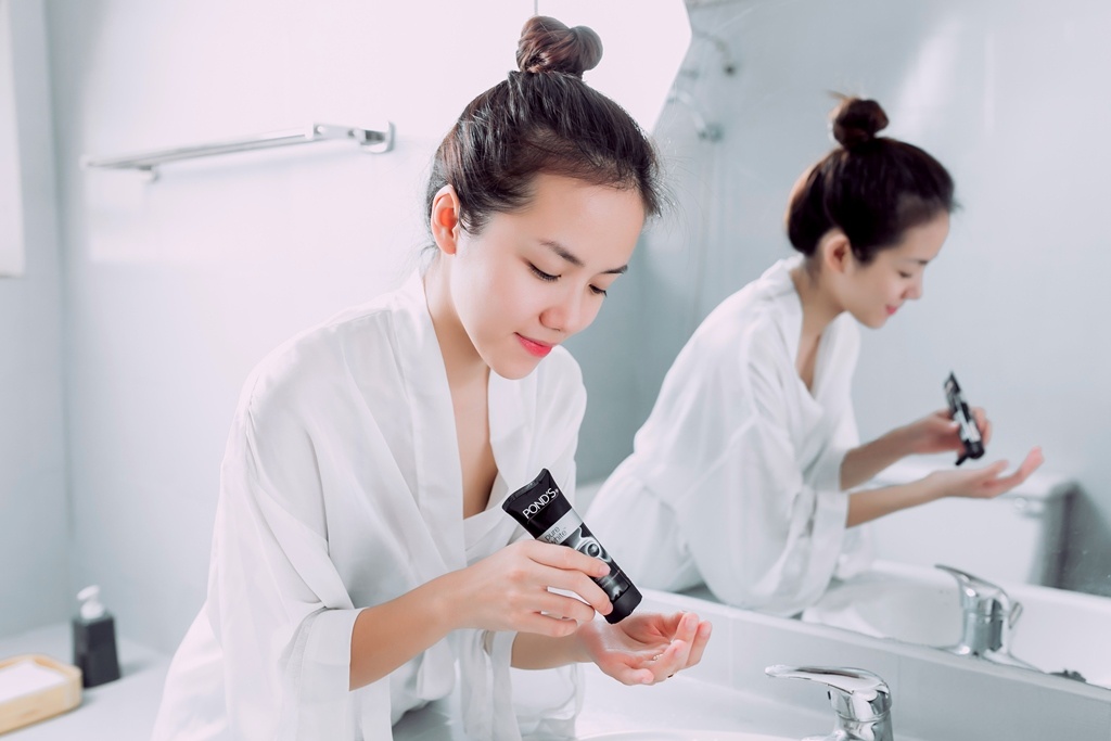 Phương Ly tiết lộ do tiếp xúc với nhiều khói bụi khi di chuyển và thường xuyên trang điểm nên cô chọn sữa rửa mặt Pond's Pure White để làm sạch da.