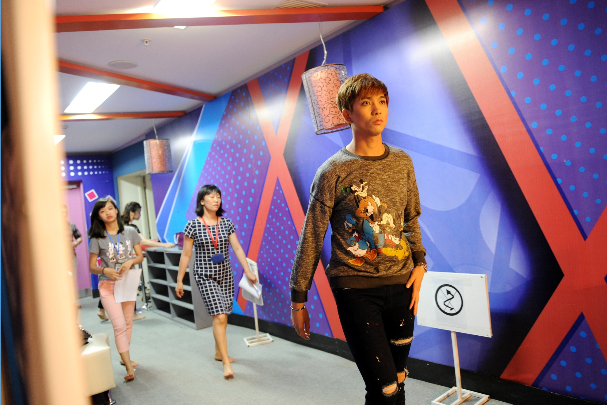 | Đến nhà đài, Tim thay đồ và nhanh chóng vào trường quay để thực hiện buổi ghi hình. Tới với chương trình của Ban thanh thiếu niên, nam ca sĩ lựa chọn trang phục xì-tin với họa tiết hoạt hình ngộ nghĩnh. |