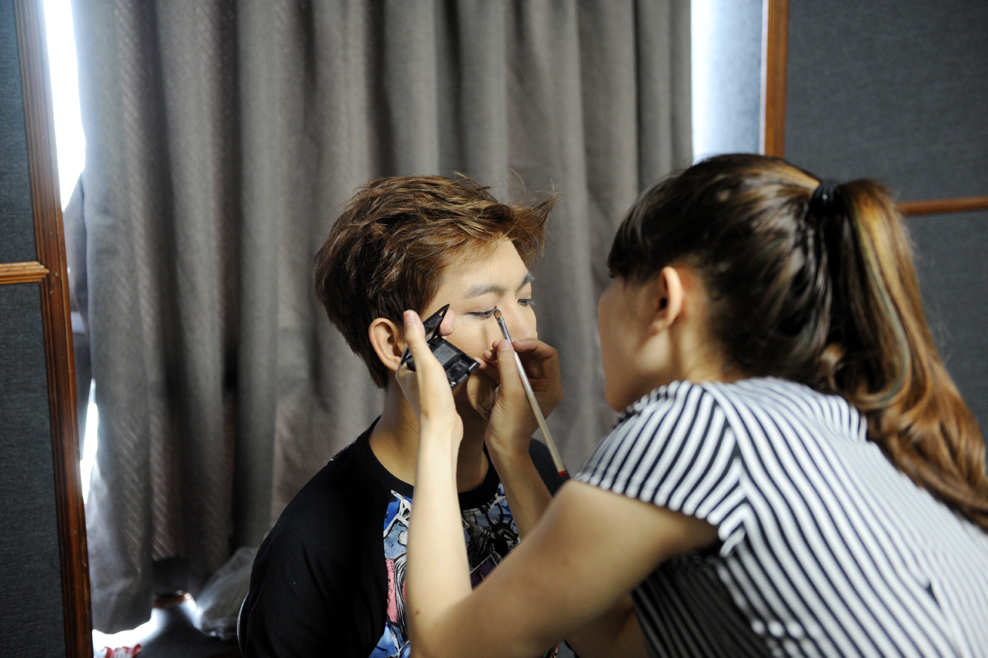 9h, Tim có mặt để trang điểm. Nam ca sĩ tâm sự, vì lịch trình dày đặc, anh chỉ ngủ được 2 tiếng trước khi dậy chuẩn bị đồ đạc và tức tốc bay ra Hà Nội vào rạng sáng. Lúc này, mắt nam ca sĩ vẫn đỏ hoe vì thiếu ngủ. Công việc bộn bề, ngay cả trong lúc trang điểm, Tim vẫn tranh thủ trả lời điện thoại và tin nhắn.