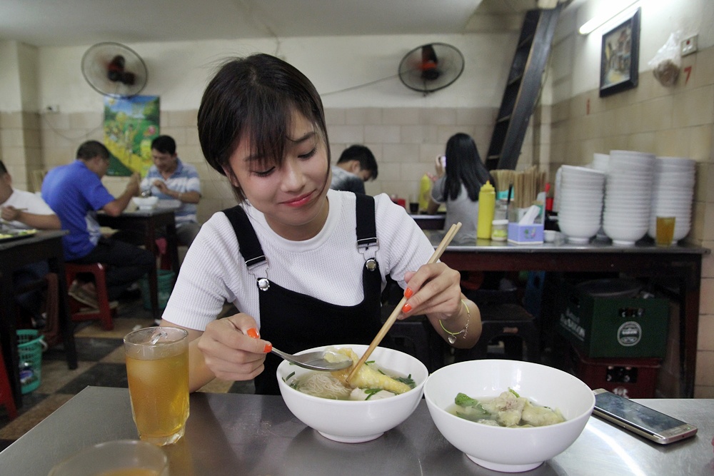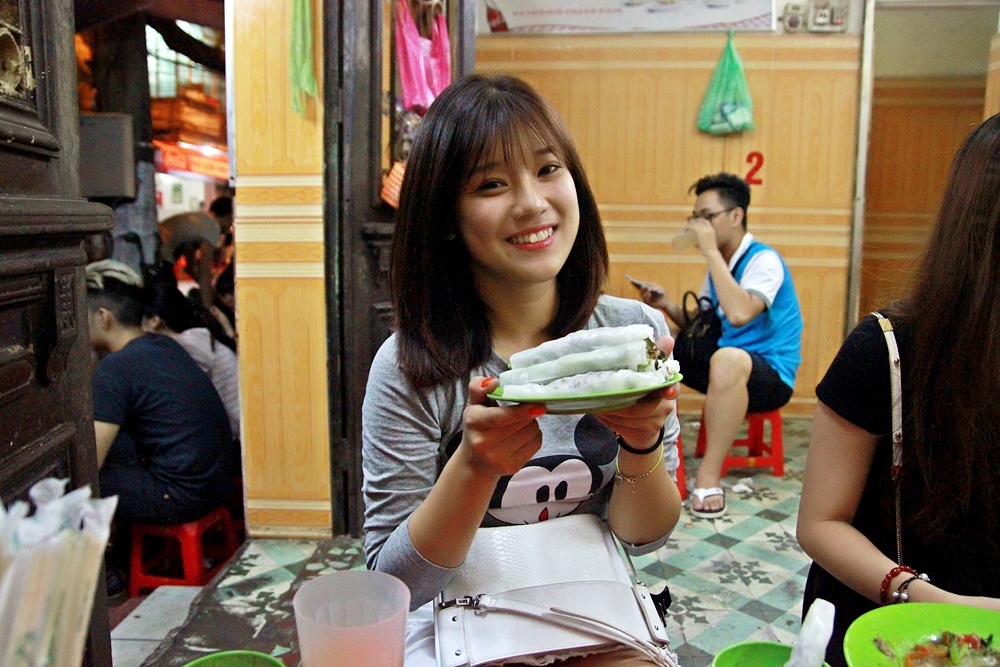 Hot girl sau đó đến một tiệm ăn đêm ở gần hồ Tây thưởng thức món phở cuốn. Thay vì chọn nhà hàng đắt tiền, 9X chia sẻ, cô thích ngồi ăn ở những quán lề đường hơn. "Vì trong miền Nam không có món này nên mình tranh thủ ăn thật nhiều cho đỡ thèm" - cô nói.