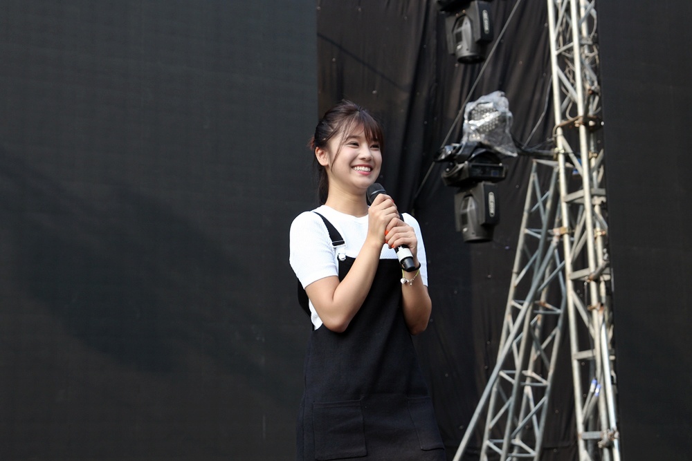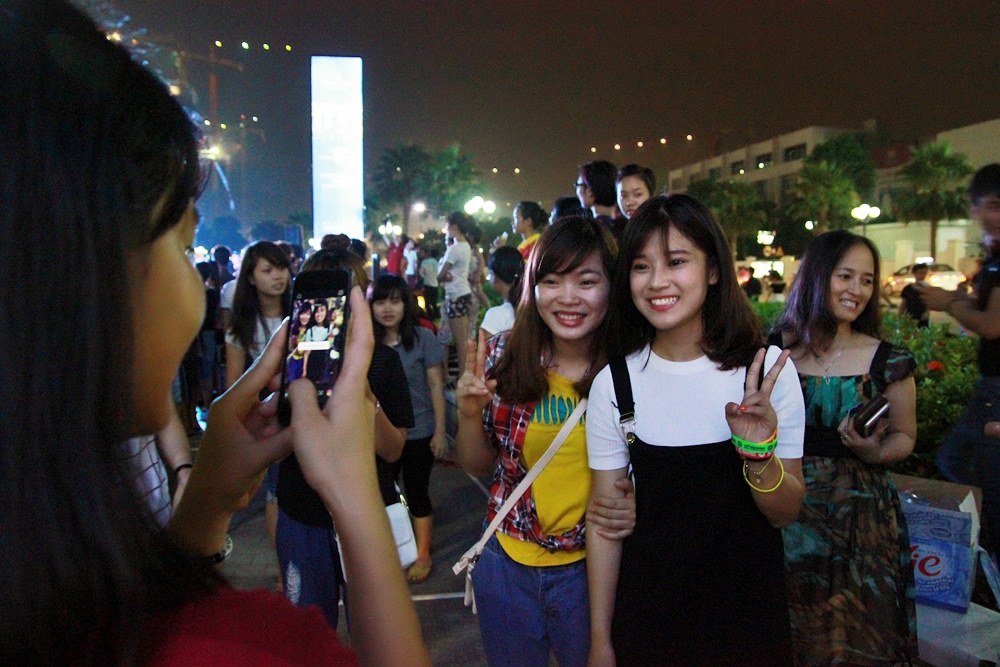 | Trước lúc rời sân khấu, cô bị một số fan "bắt cóc", xin chụp ảnh chung. 9X thân thiện nở nụ cười rạng rỡ trước ống kính dù vẫn còn khá mệt sau khi thể hiện nhiều bài hát sôi động. |