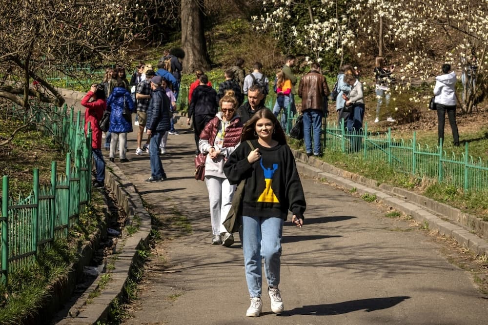 | Một người dân tận hưởng hoa xuân nở rộ trong công viên tại Kyiv. |